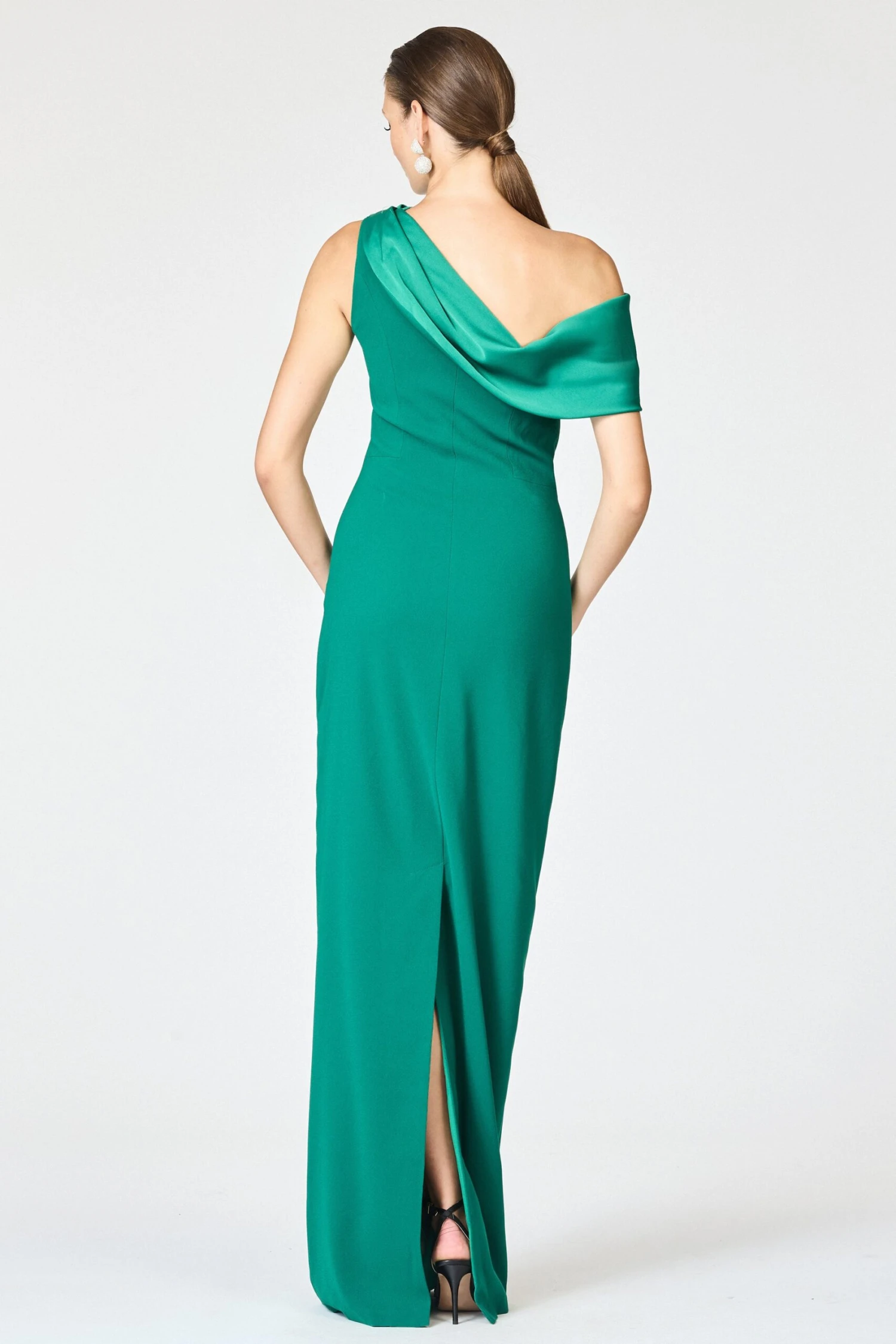 The Angelina Gown in Emerald is a masterclass in modern, sculptural elegance. Cut in a sleek column silhouette, it glides along the body with quiet confidence for a flawless, figure-defining fit. The asymmetrical one-shoulder neckline is artfully draped into a bold, folded overlay, creating striking dimension while showcasing the collarbone with effortless sophistication. Crafted in fluid crepe for a clean, polished finish, Angelina is designed for evenings that call for unforgettable glamour and timeless appeal.