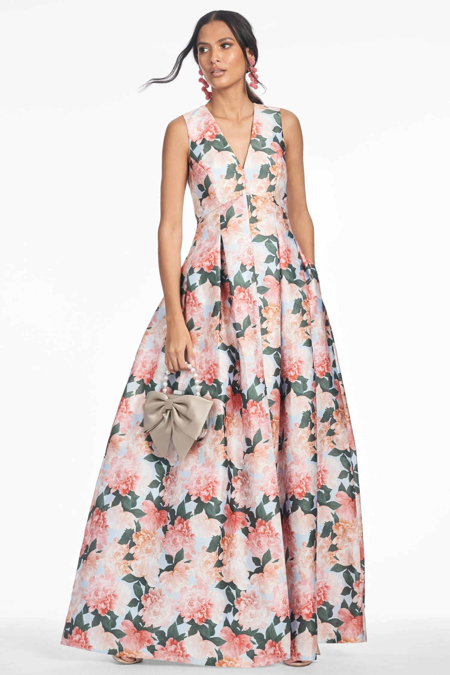 The Brooke is our V-neck gown with box pleats, peaked waist seam, and side pockets. This dress is what we consider to be a classic, essential silhouette – a perfect canvas for our most breathtaking prints.