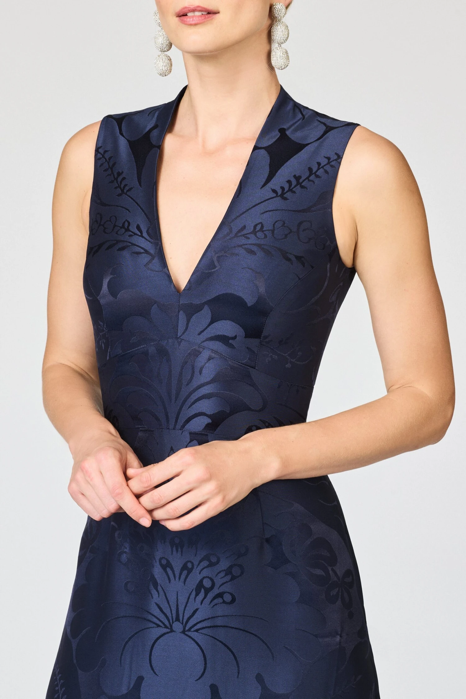 Refined and effortlessly elegant, the Cella Gown is crafted in a rich denim-hued damask with a tonal floral motif that adds depth and subtle sheen. The perfect choice for any black-tie event.
