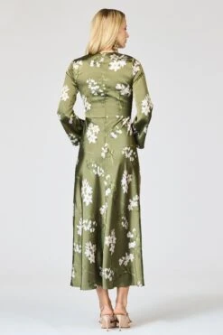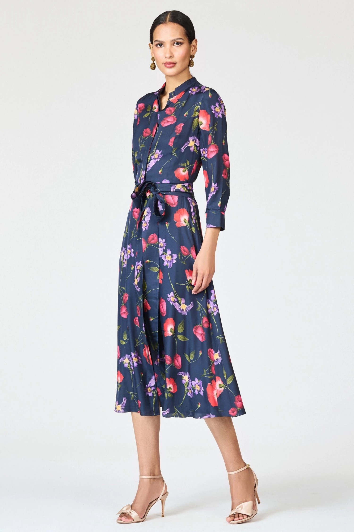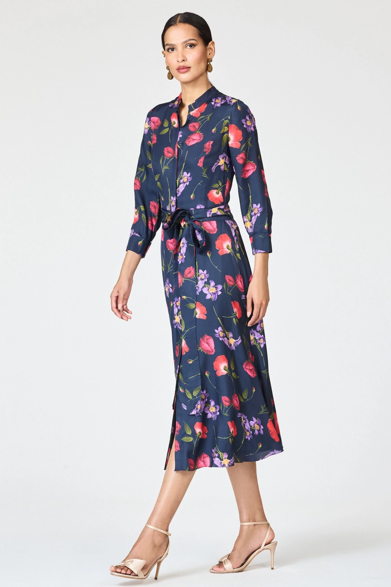 Elizabeth is a tailored, graceful, and playfully vibrant “desk to dinner” dress . Cut in printed silk-viscose twill, the shirt-dress silhouette features a flattering stand collar, summary front, and a soft tie belt to cinch the waist. The Midnight Jardin floral print adds a romantic burst of rich color, making her the perfect pick for everything from garden lunches to gallery evenings.
