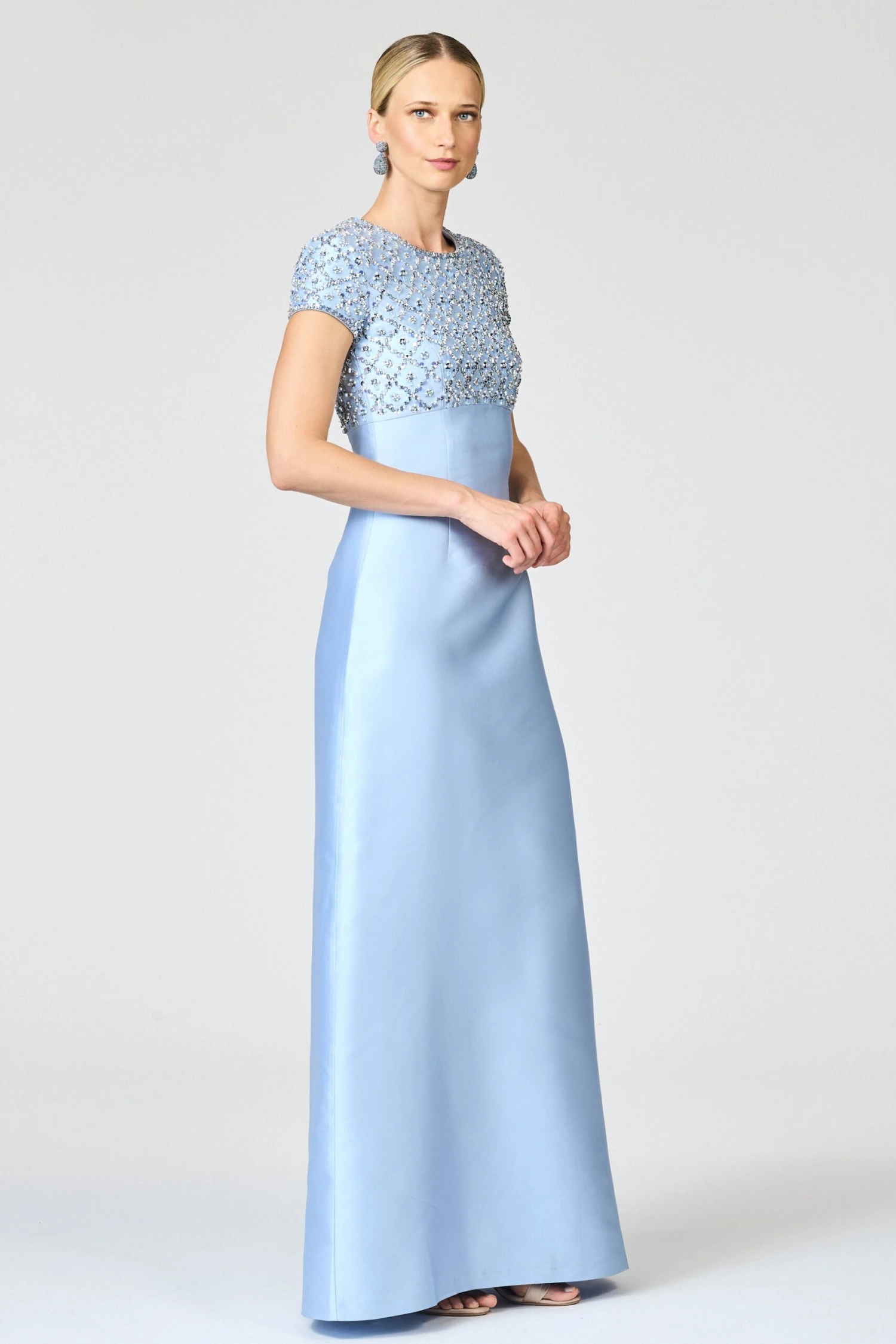 The Amsterdam Gown in Glacial Blue is an ode to quiet glamour and timeless sophistication. The bodice is richly hand-embroidered with tonal beads and sequins in a soft lattice motif, casting a delicate shimmer across the structured gazar. A round neckline and short sleeves frame the shoulders with classic grace, while the clean column skirt falls in a smooth, statuesque line. Amsterdam is a refined choice for galas, formal weddings, and evening affairs. Each embroidered panel is hand-finished by our third-generation artisans in our family-owned Mumbai atelier.