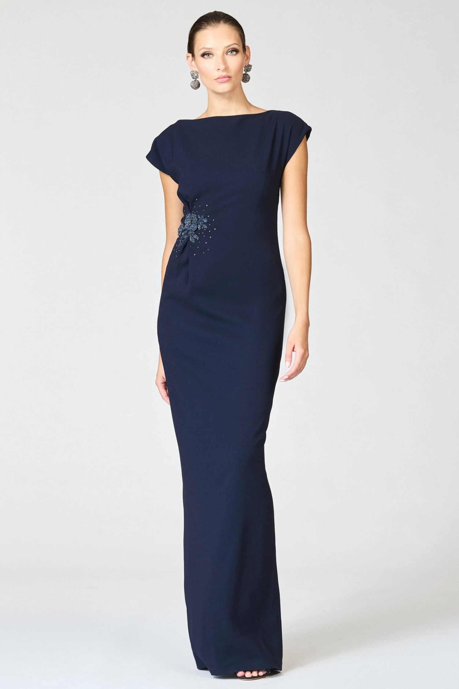 Kelly is refined and quietly radiant, with a silhouette that speaks in soft structure and modern grace. Cut in satin-back stretch crepe, the gown features a bateau neckline, cap sleeves, and a sleek column shape that gently skims the body. A gathered detail at the waist is accented with hand-embroidered beading in a starburst motif—adding just the right amount of shimmer and sculptural interest. Understated but never overlooked, Kelly is an elegant choice for evening occasions that call for subtle brilliance.