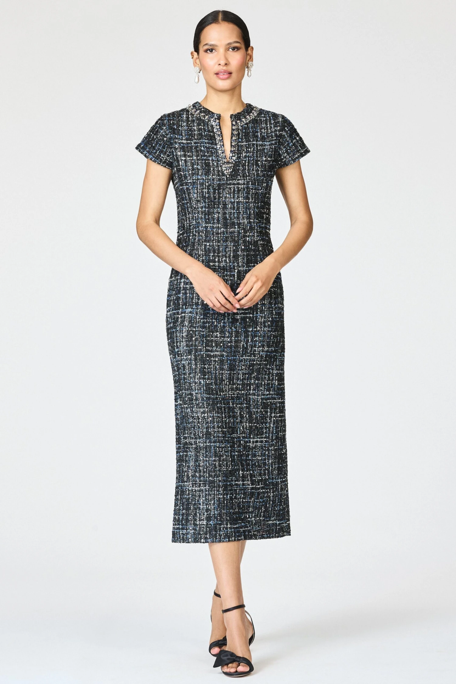 The Liz Dress brings structure and sparkle in equal measure. Crafted in Obsidian Frost tweed, this sleek, tailored silhouette is softly shaped through the body and finished with a subtle slit at the neckline. The collar is gently embellished for a hint of shine—just enough to elevate, never overpower. A polished choice for both daytime occasions and dressed-up evenings.