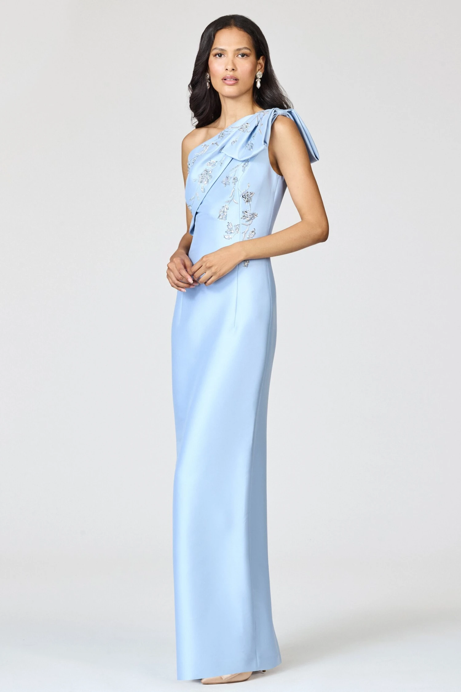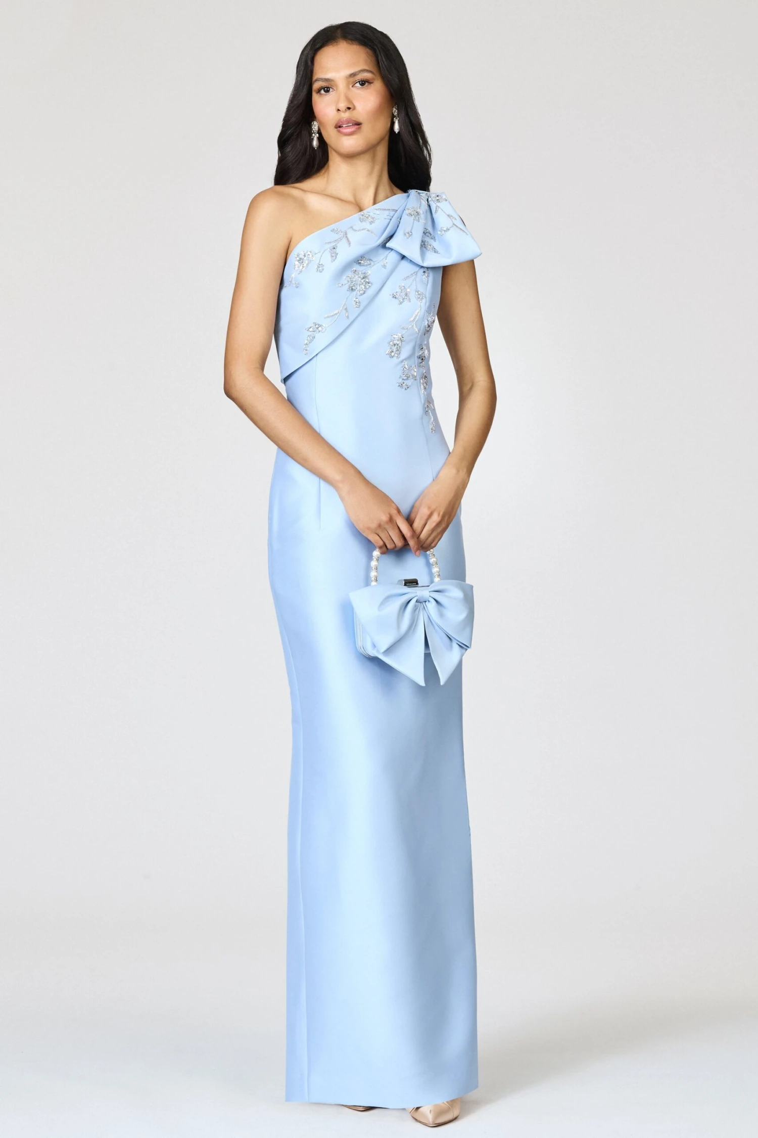 Meet Olivia, a modified take on our iconic Bonnie. Here in Glacial Blue, with floral embellishment throughout the bodice, artfully embroidered by our 3rd generation artisans at our family-owned atelier in Mumbai. This one-shoulder silhouette has a uniquely imagined bow that is hand-applied and embroidered.