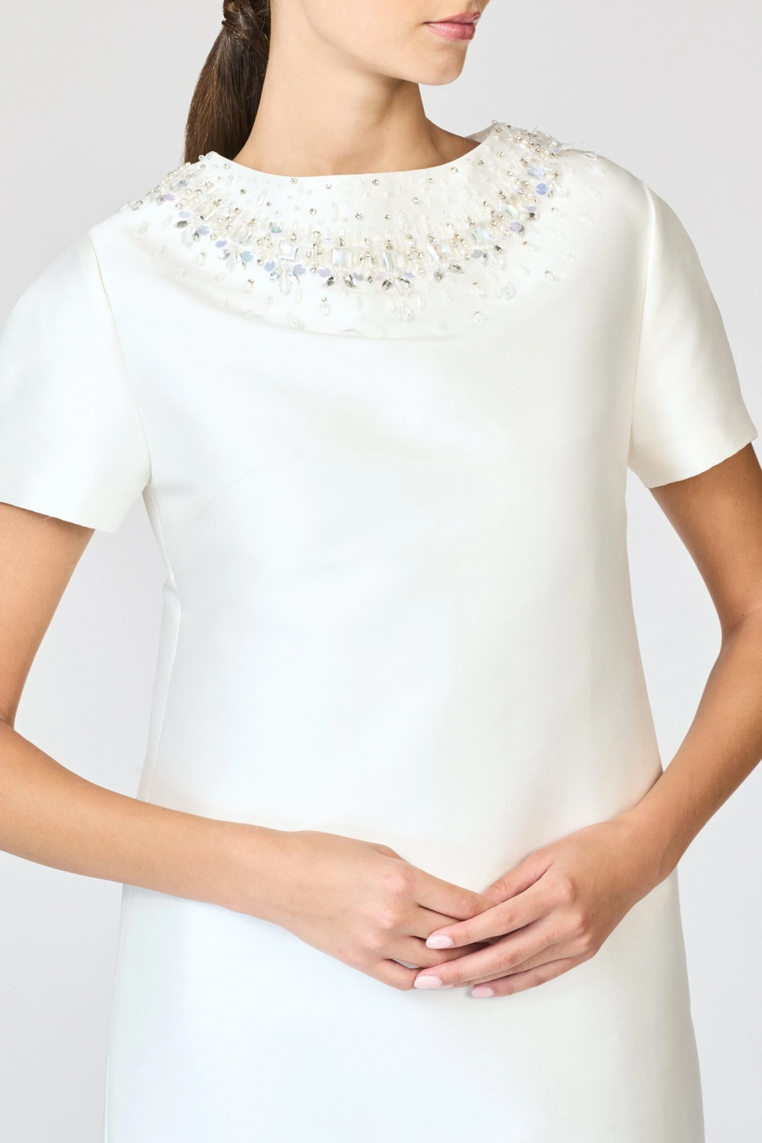 Clean, modern, and undeniably chic—the Erin Dress in Ivory is an elevated take on the classic shift silhouette. This short-sleeve mini dress features a streamlined A-line shape with a jewel neckline embellished with a constellation of faceted crystal and bead detailing for soft, light-catching dimension. The minimalist design balances the ornate neckline, creating a polished option for rehearsal dinners, cocktail parties, engagements, weddings, or any special event.