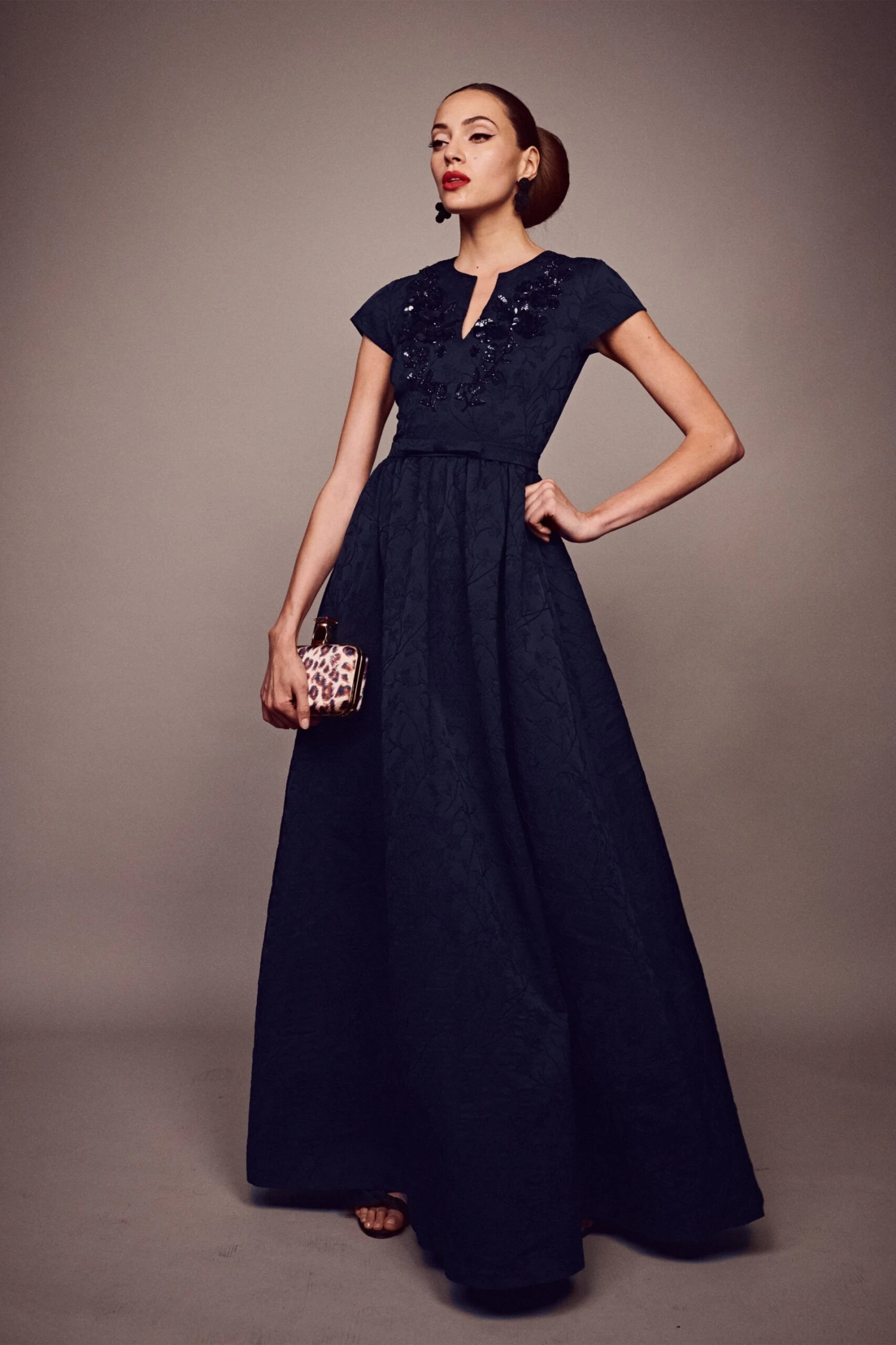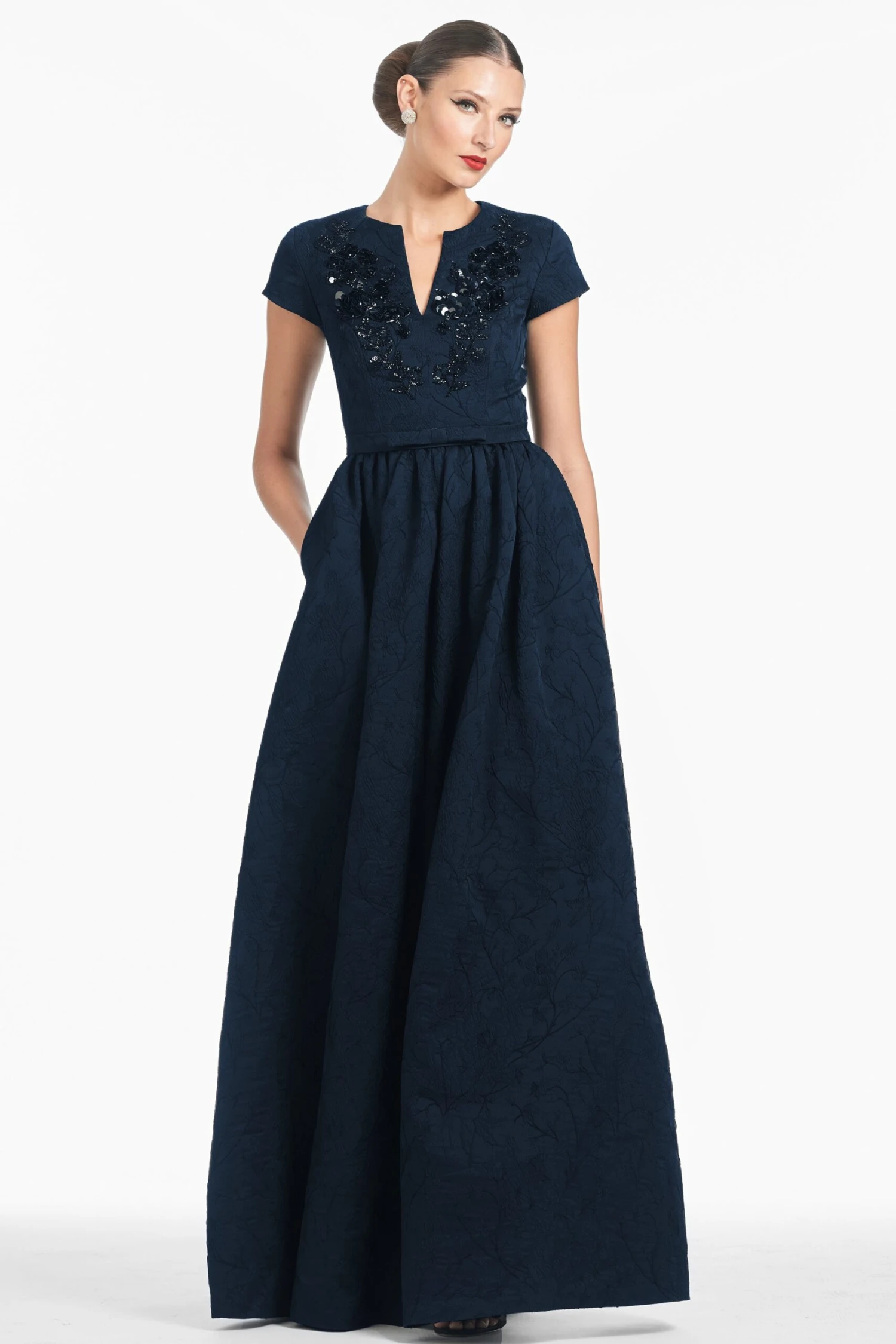 There’s more than meets the eye with Estelle. All over Jacquard Cloque comes together with cap sleeves, a slight V, and embellishment at the bodice to create a classic, forever piece. A thin belt meets in the middle and the skirt cascades into an effortless A-line. Pure elegance embodied.