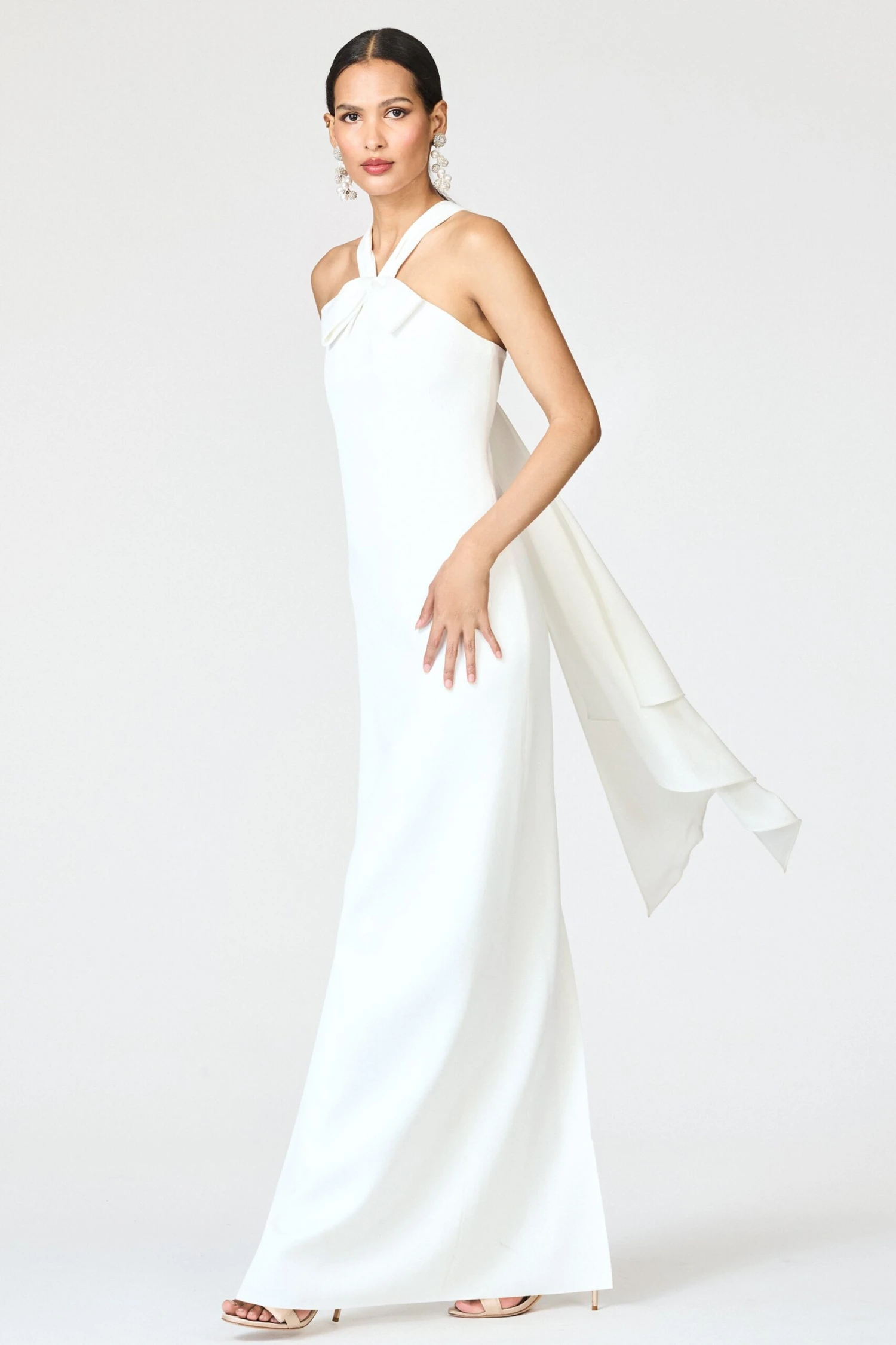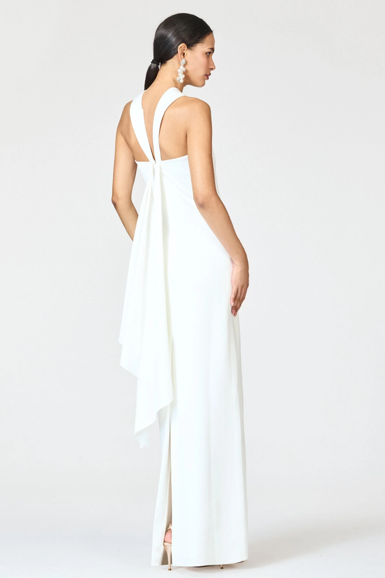 A study in understated drama, the Fern Gown in Ivory is defined by its sculptural halter neckline that forms into an elegant bow at the front. Crafted in a fluid crepe, this floor-length silhouette is tailored to skim the figure with quiet sophistication. At the back, two softly draped streamers descend from the halter straps, creating layered movement and romantic dimension as you walk. A subtle back slit adds ease to the straight skirt. Fern Gown is a modern classic that balances architectural detail with timeless polish.