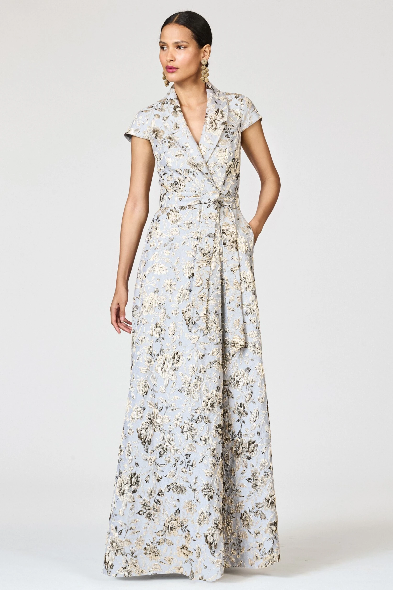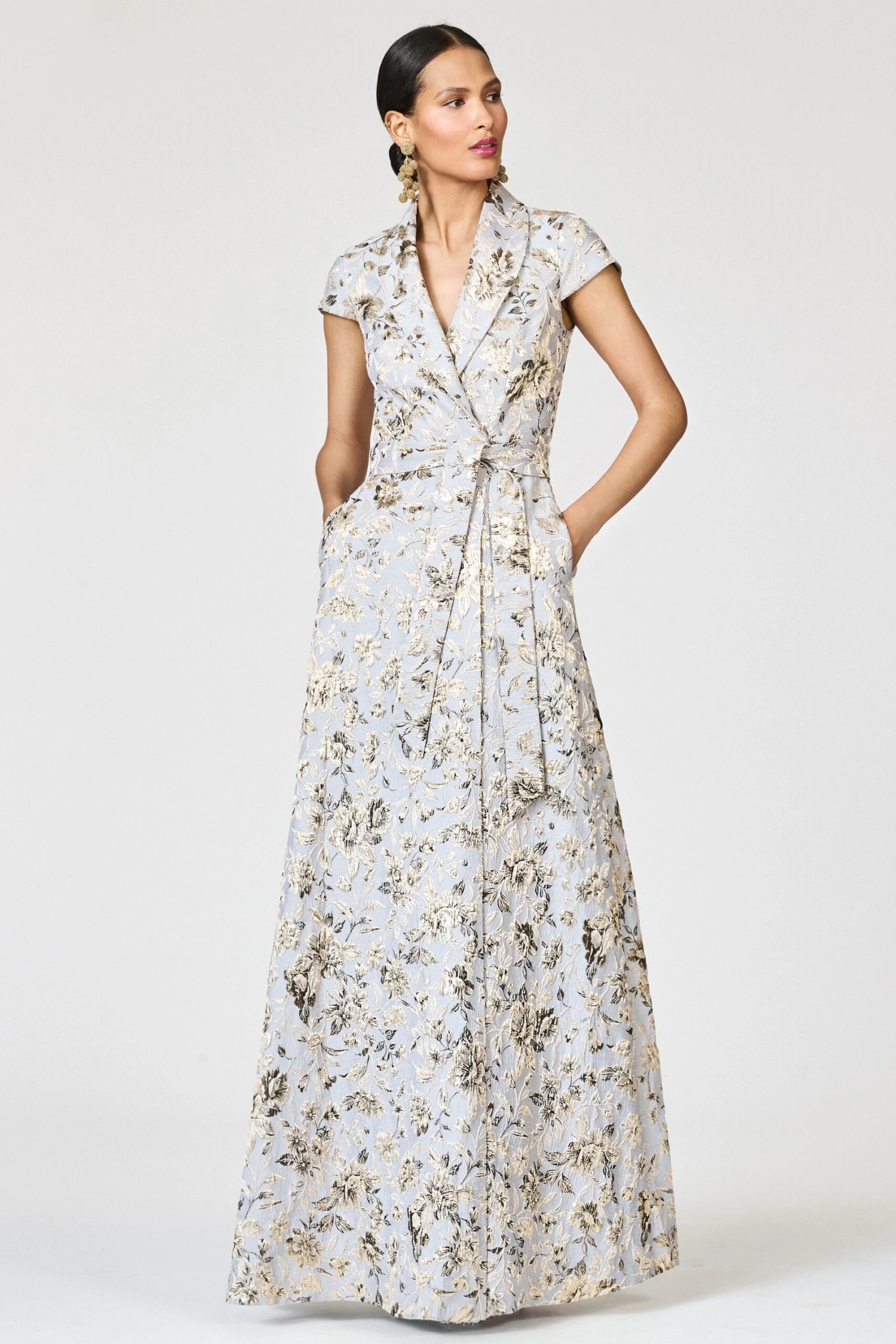 The Honora Gown in Golden Gardens print is a refined blend of timeless tailoring and romantic artistry. Crafted in a structured jacquard with a luminous floral motif in gold and pewter tones, it exudes quiet opulence. The shirt-dress inspired bodice features a shawl collar, cap sleeves, and a wrap-front tie belt that cinches the waist with effortless sophistication. A softly structured a-line skirt completes the silhouette with graceful ease. Both polished and striking, Honora is designed for occasions that call for modern elegance and classic charm.