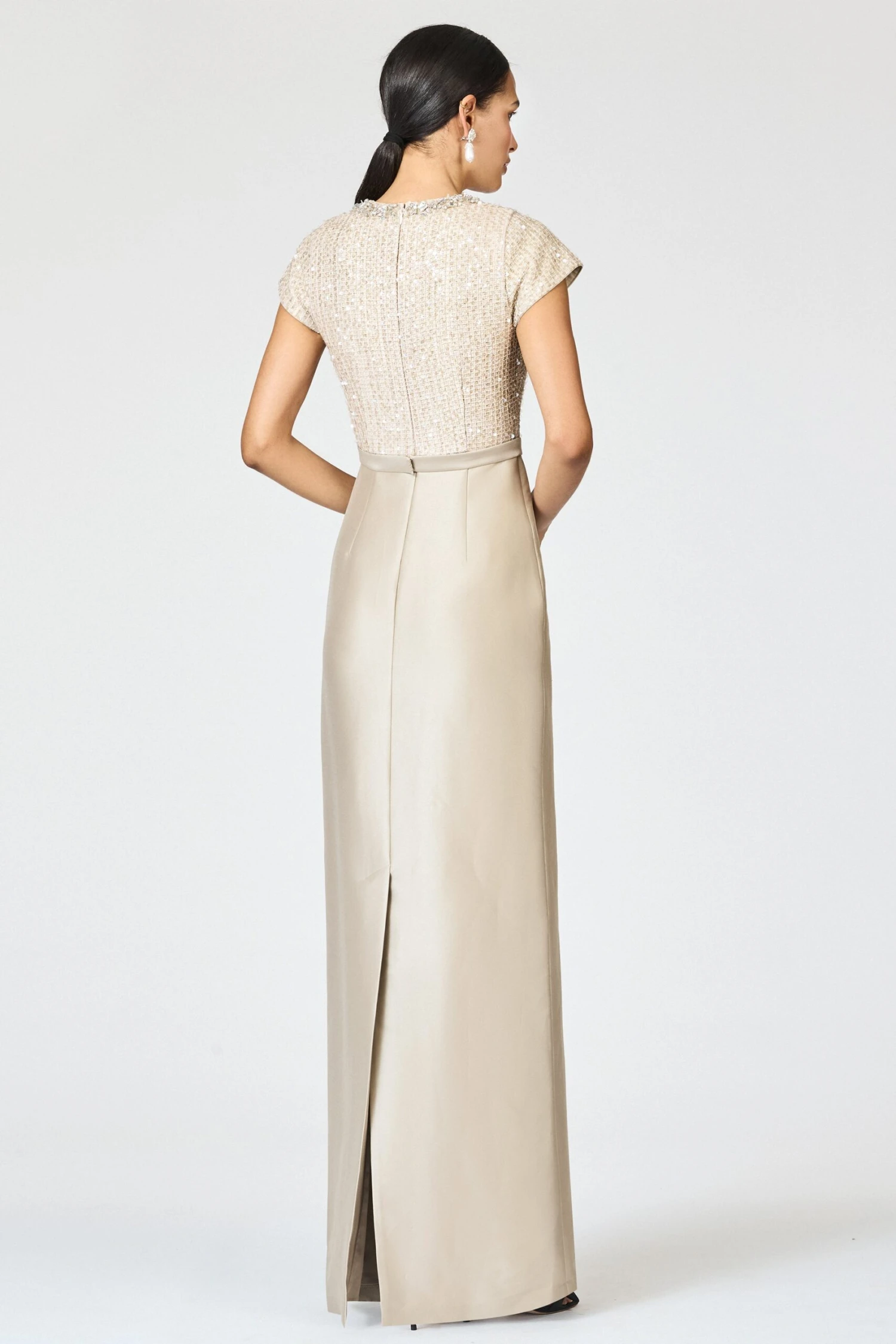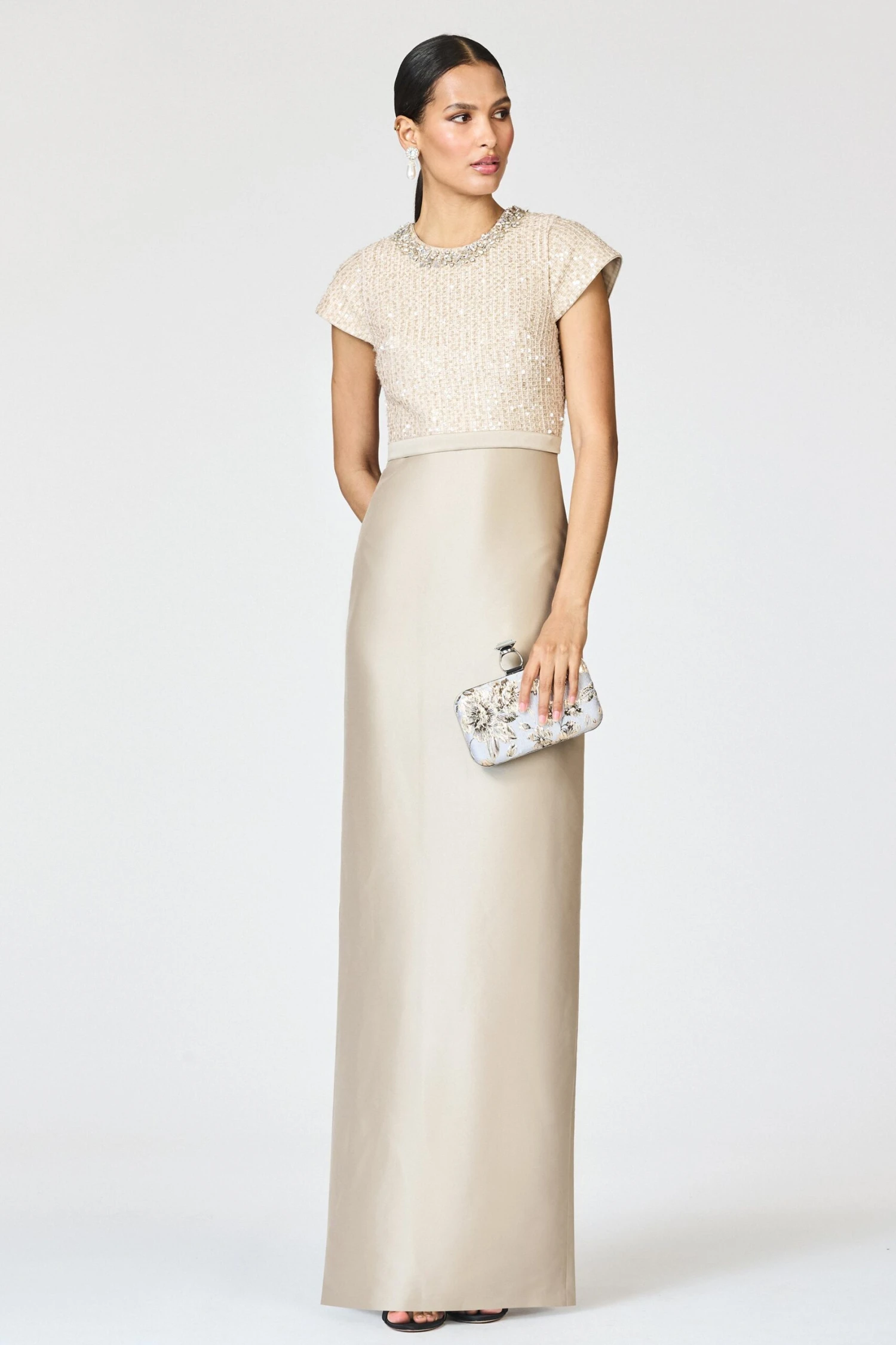 The Isla Gown in Dune/Pewter is a study in understated luxury and modern refinement. The bodice features a column silhouette paired with a cap sleeve crafted in tonal sequin tweed, catching the light with subtle, sophisticated shimmer. At the neckline, an ornate crystal-embellished collar adds an extra layer of radiance and polish. A clean Mikado skirt in Pewter drapes in a statuesque column, cinched with a coordinating waistband to define the figure. Effortlessly elegant, Isla is artfully embroidered by our 3rd generation artisans at our family-owned atelier in Mumbai.