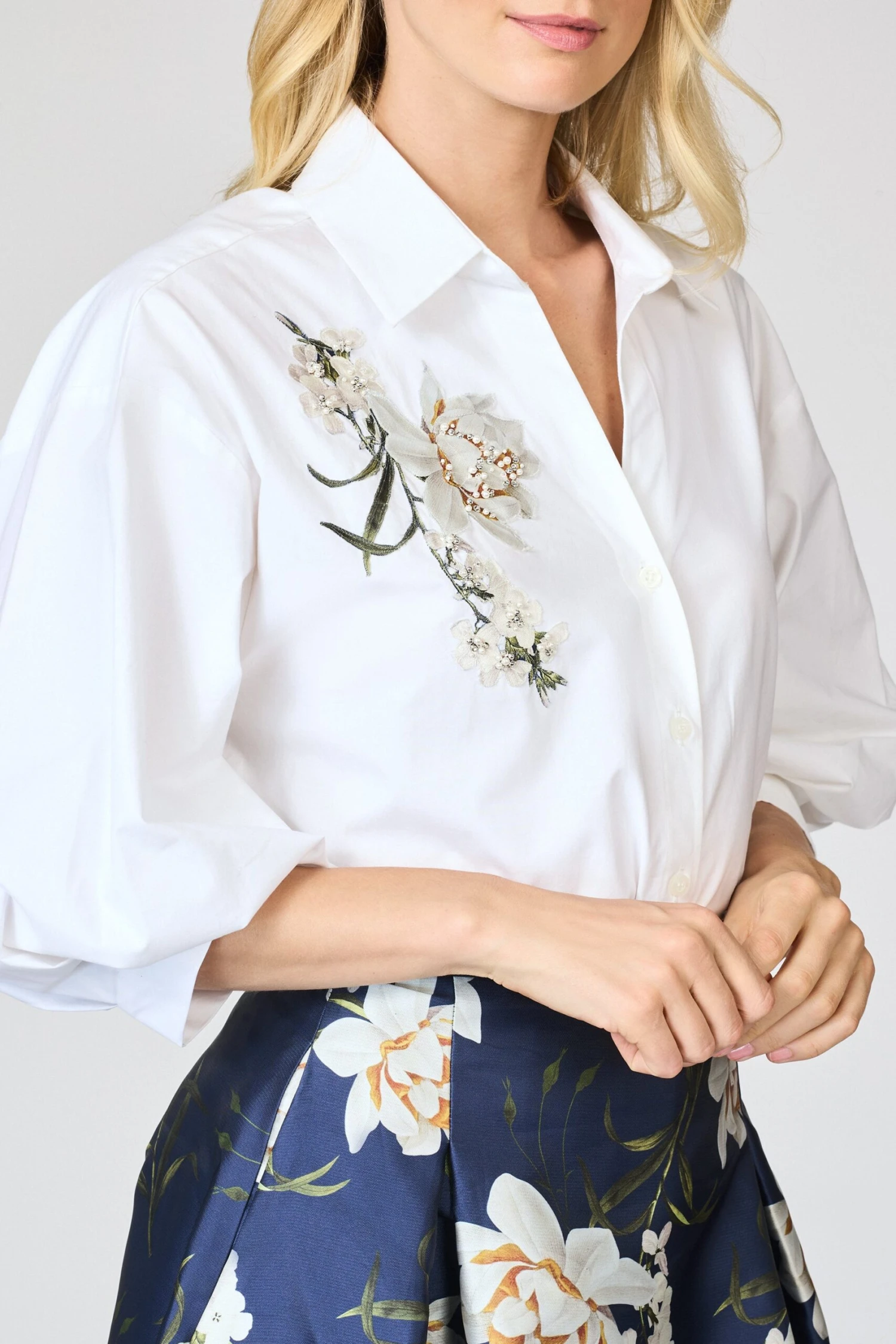 Luce is quite special, her silhouette intended for the perfect French tuck. The 100% cotton shirting is highlighted at the side with a beautiful custom-designed floral motif bringing in a warm ivory subtly lit with sequins. Worn back to your favorite jeans or our ivory sequin pencil skirt, Luce understands how to go hi-low.