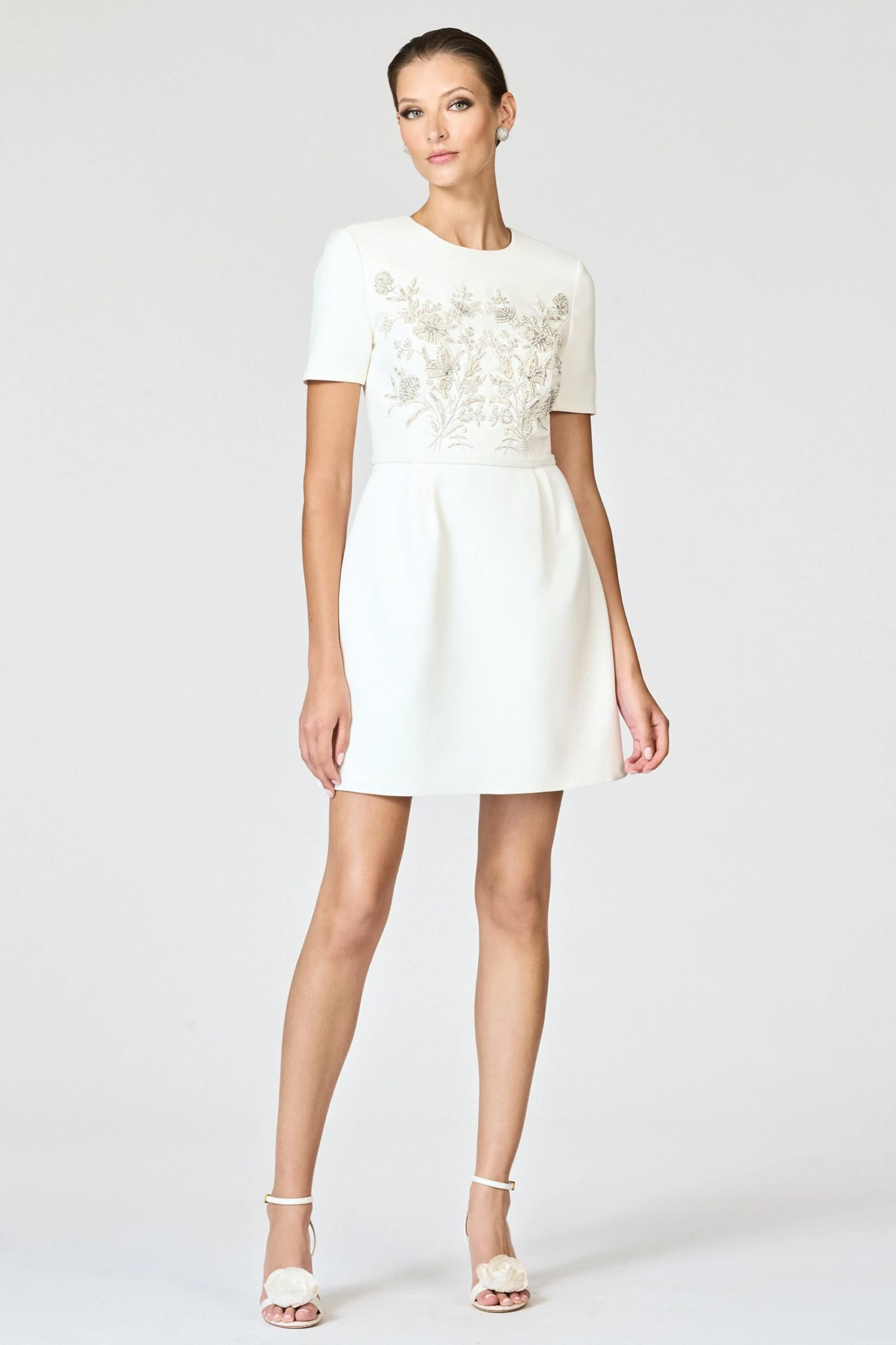 The Luna Dress is a study in modern elegance, featuring a softly tailored silhouette and short sleeves. Intricate beadwork in a botanical motif adorns the bodice, bringing texture and radiance to the refined design. The ivory hue adds timeless appeal, making this piece a polished choice for any special occasion.