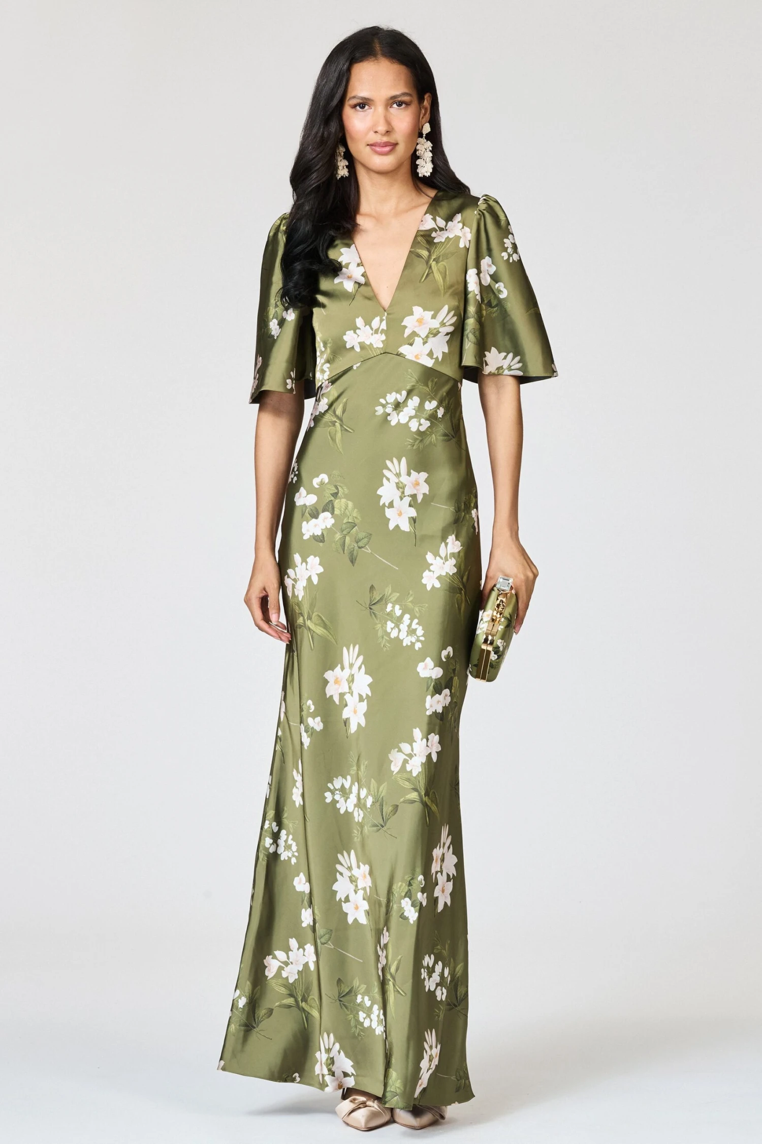 Elegant, effortless, and subtly demure the Mae Gown in Moss Formosa. The V-neckline and the universally flattering A-line silhouette create a figure-skimming silhouette, while the flutter sleeves add a bit of coverage and a bit of drama.