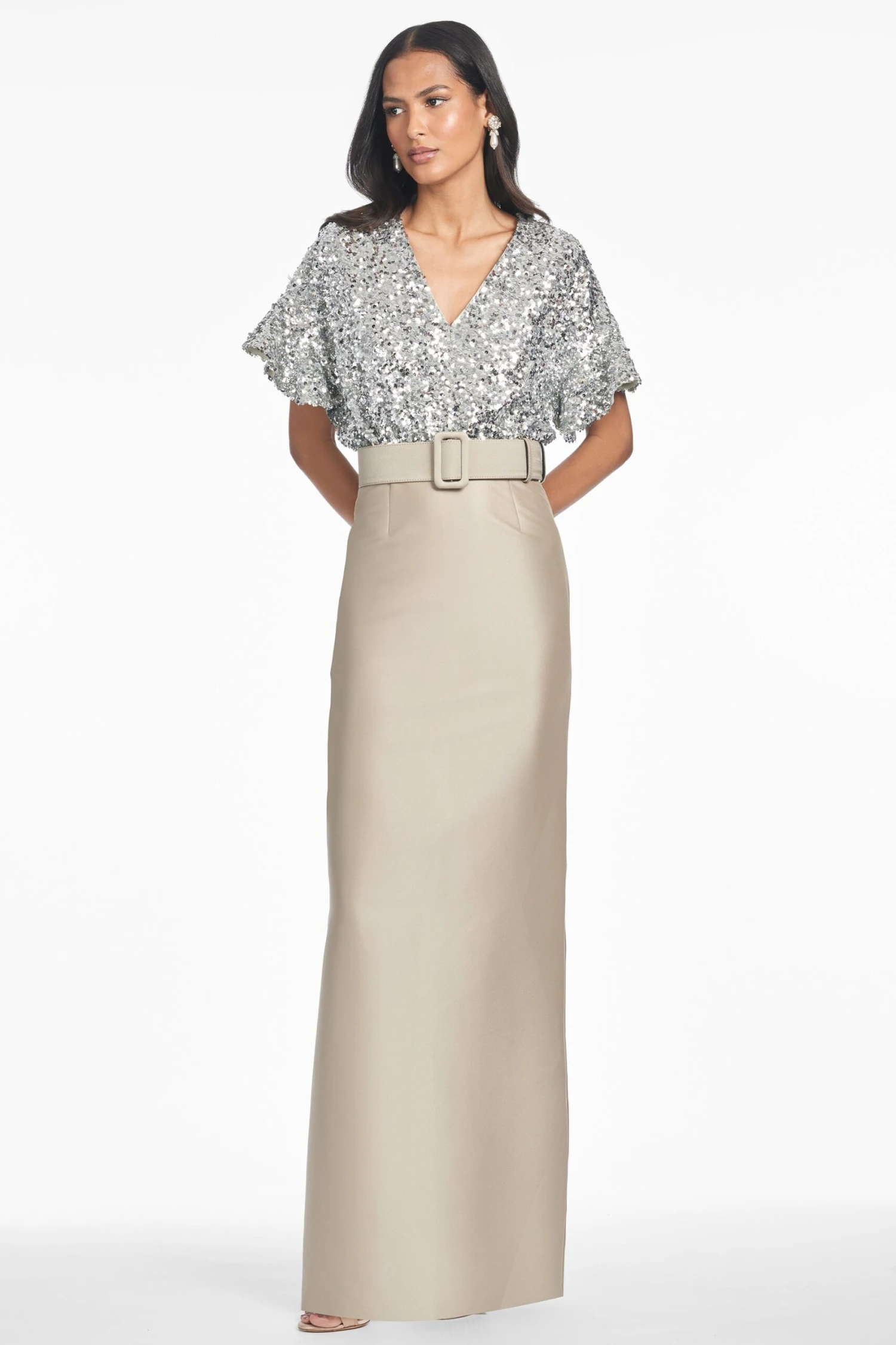 Prepare to turn heads in the Marlene. A classic column skirt in double-face Mikado meets glittering metallic stretch micro-sequins for the ultimate black-tie ensemble. The drop sleeve offers an easy elegance to this otherwise classic silhouette. A self-belt in silver pewter completes the gown.