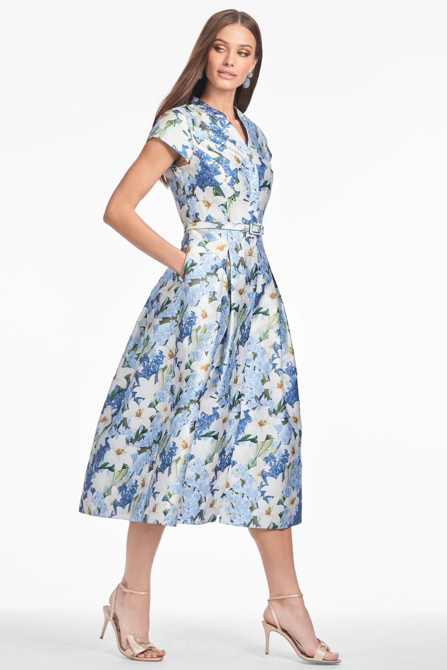 From day to night, work to happy hour, Martine is right there with you. This mid-length dress in our Sky Blue Star Lillies print features a dress-shirt style collar, cap sleeves, and a complementary skinny belt. The slight A-line skirt makes her classic, flattering, and a staple piece in your wardrobe.