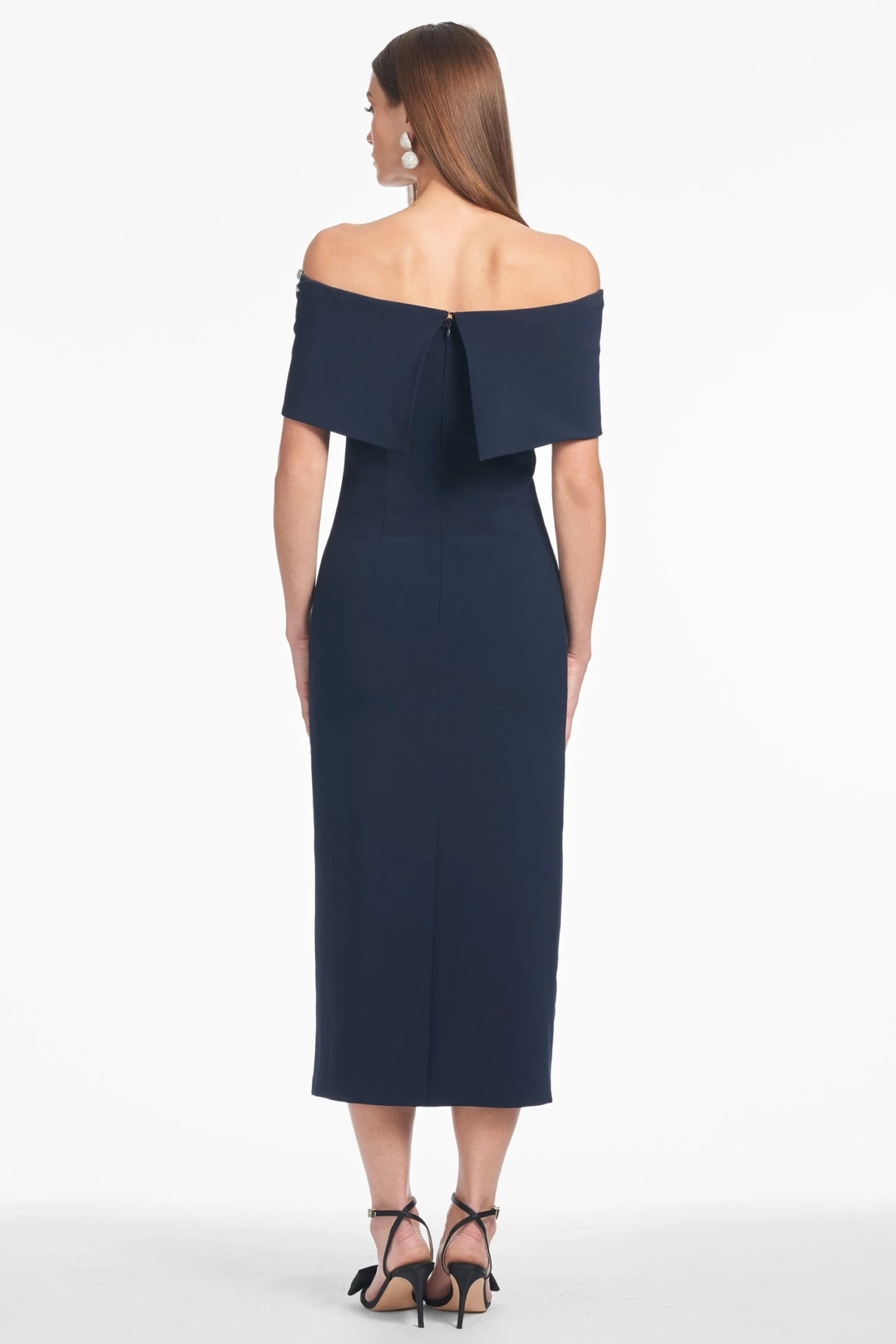Some things are classic for good reason, and this is true for Naira. The off-the-shoulder silhouette is made special by the fold over, scatter sequin neckline. The figure-hugging, thick stretch crepe makes her as flattering as she is comfortable. Simply put, exquisite.