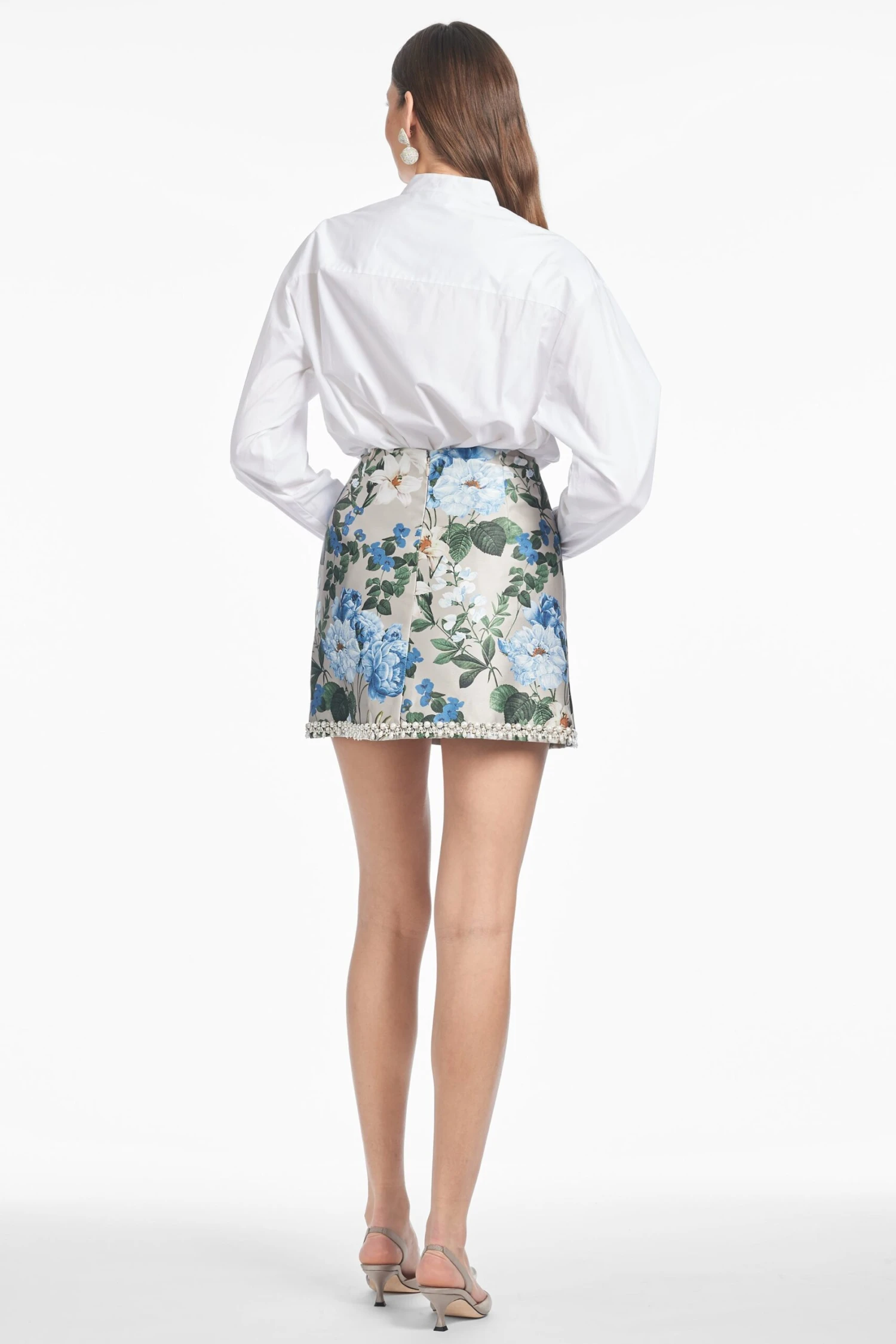 When a mini is a must but not just any little skirt will do, meet Piper. She is a small wonder, our Dune and Dusk Petals print featured in our beloved Mikado is traced at the hem with our custom-designed crystal and pearl trim designed in-house and skillfully applied by our 3rd generation artisans, who remain an integral part of our family-owned atelier in Mumbai.