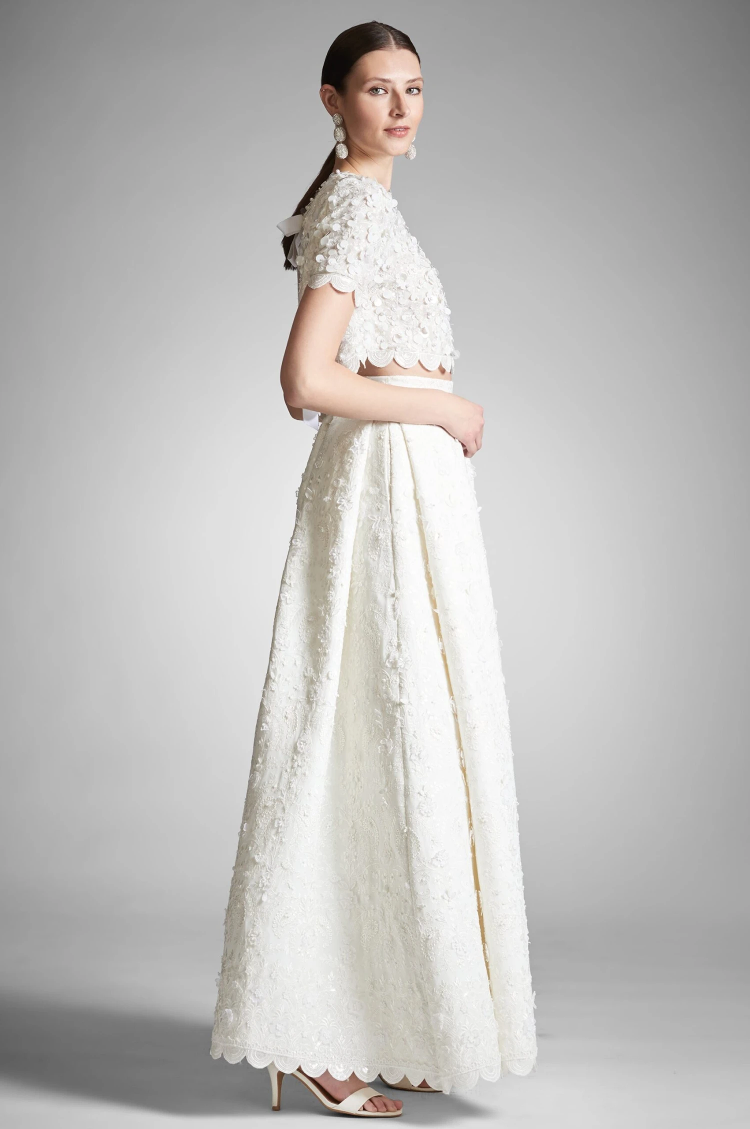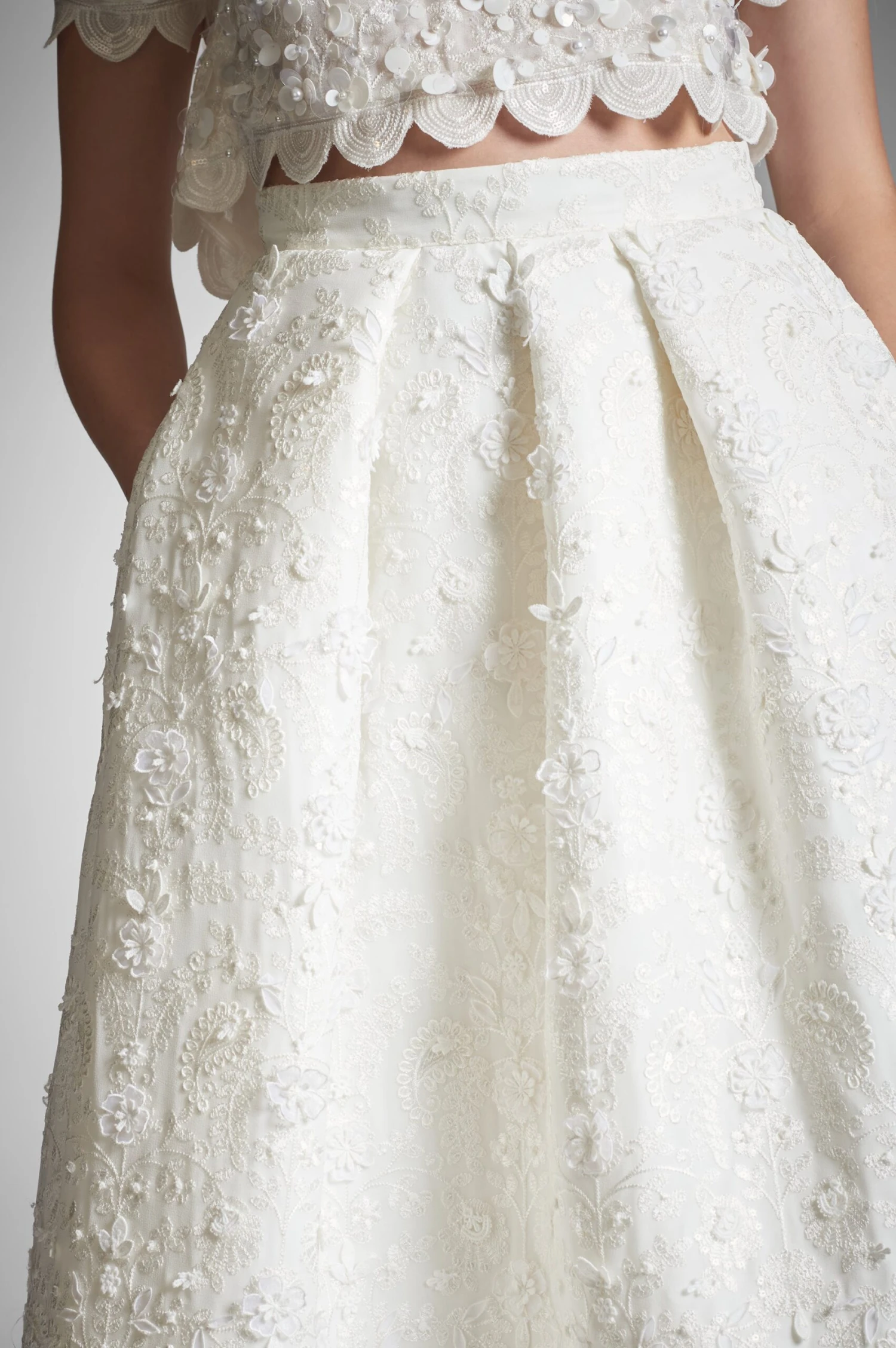 This Pyaar Skirt takes the traditional look of a bride for a stylish spin. Make your special day even more unique with this modern alternative. The two piece set features an embellished, floral applique that is carried throughout the look. The perfect choice for the brides wanting to step away from a traditional bridal gown.