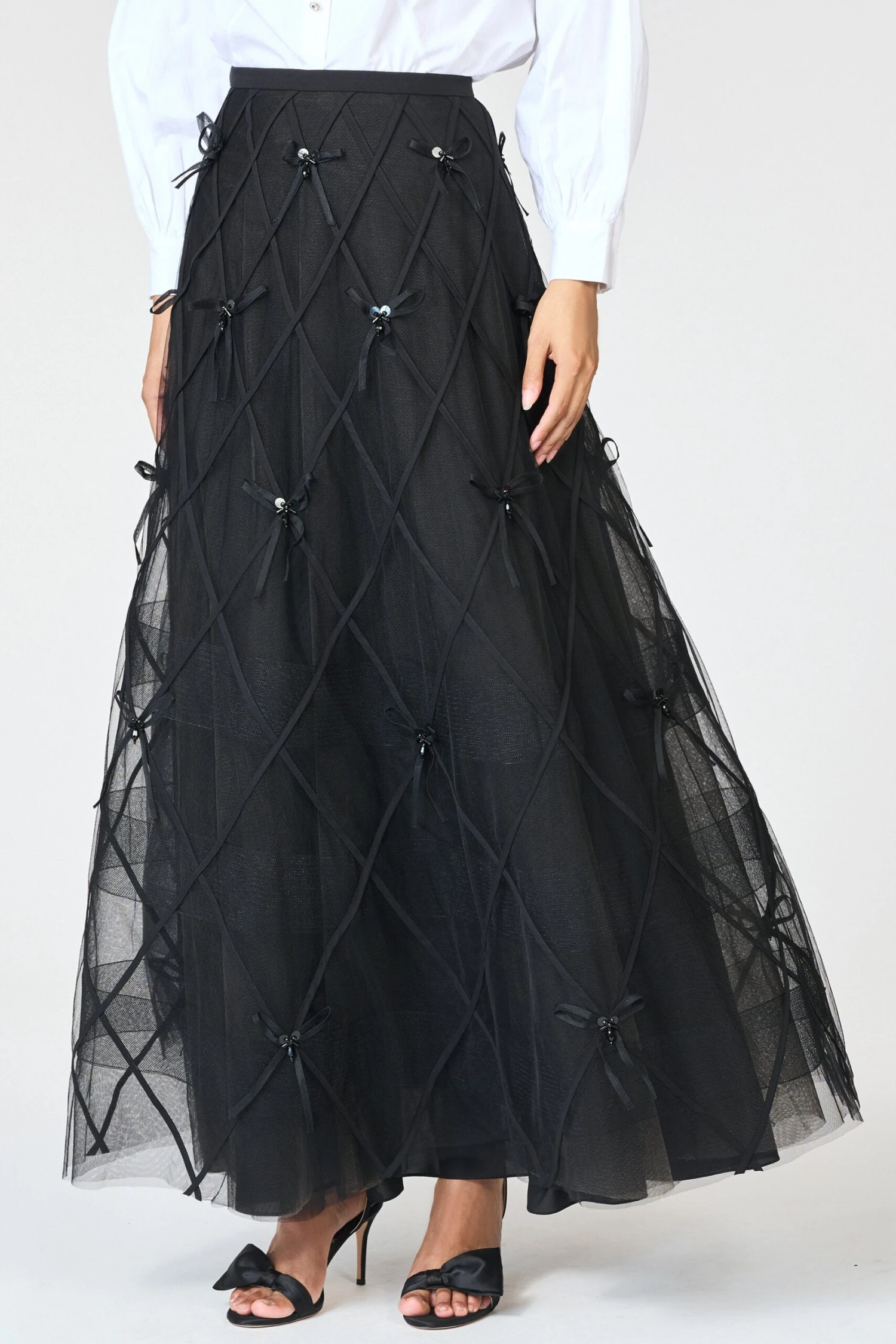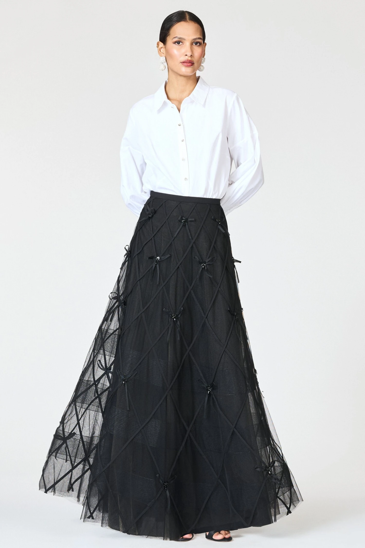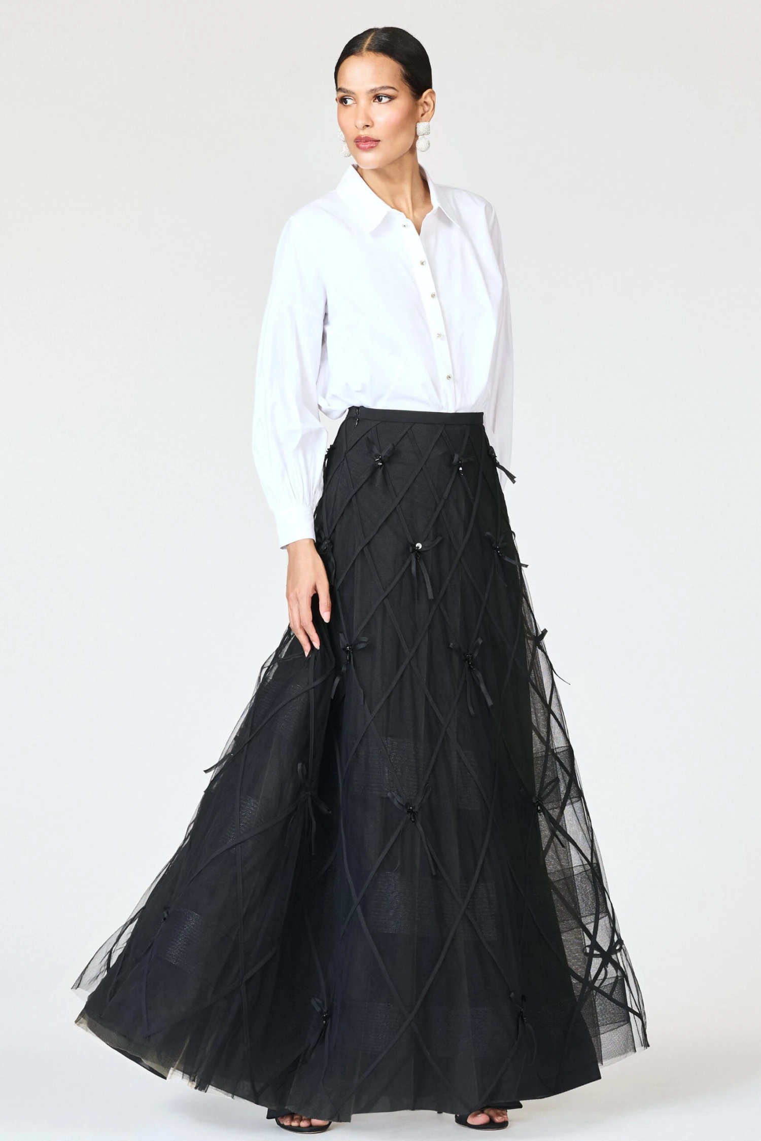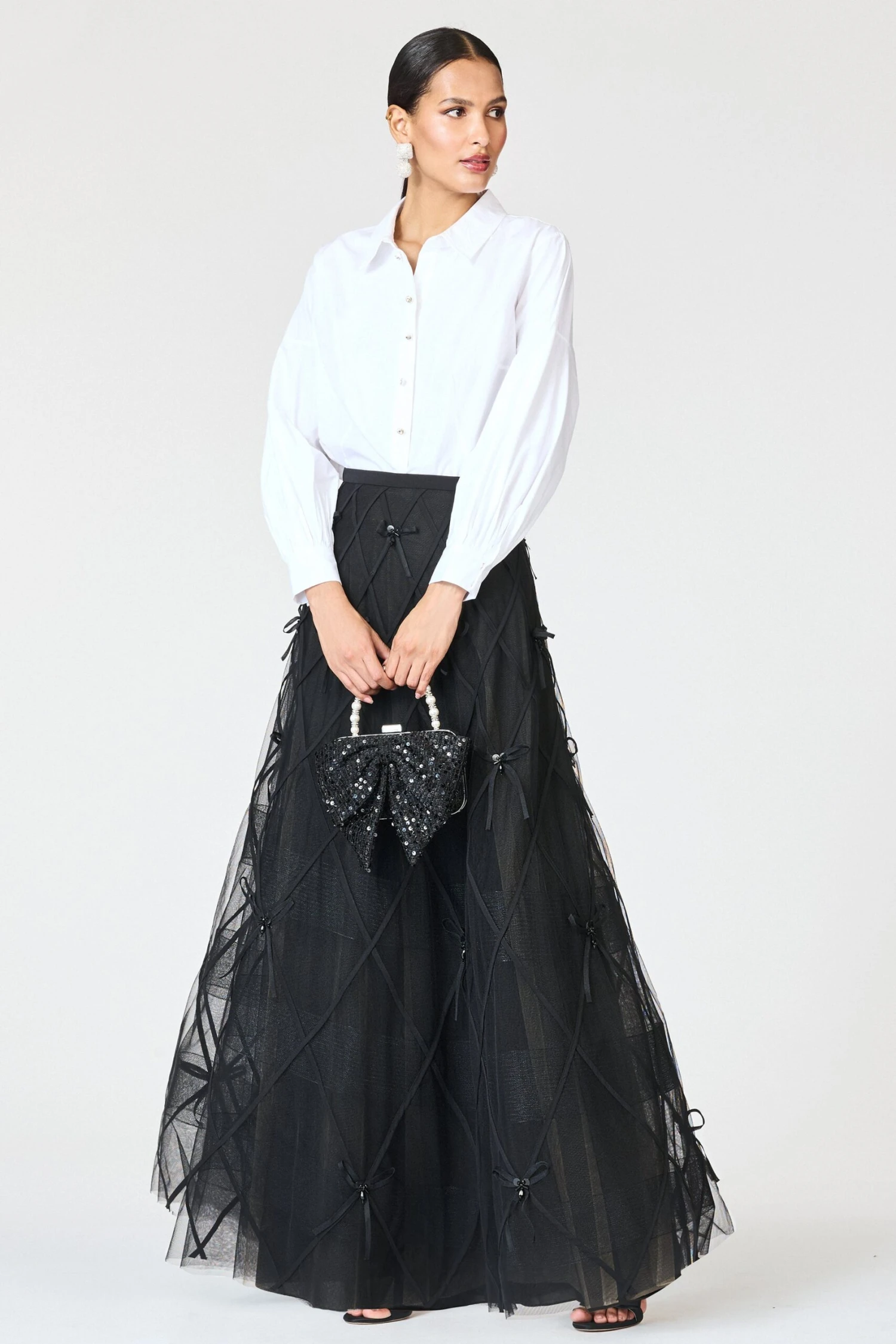 Chic and statement-making, the Robin Skirt is designed in sheer Indian tulle embroidered with an allover lattice of oversized black bows. The voluminous A-line silhouette offers dramatic movement and dimension, while the delicate transparency of the fabric adds a modern edge. Pair it with a beaded top or sleek bodysuit for an evening look that’s both playful and poised.