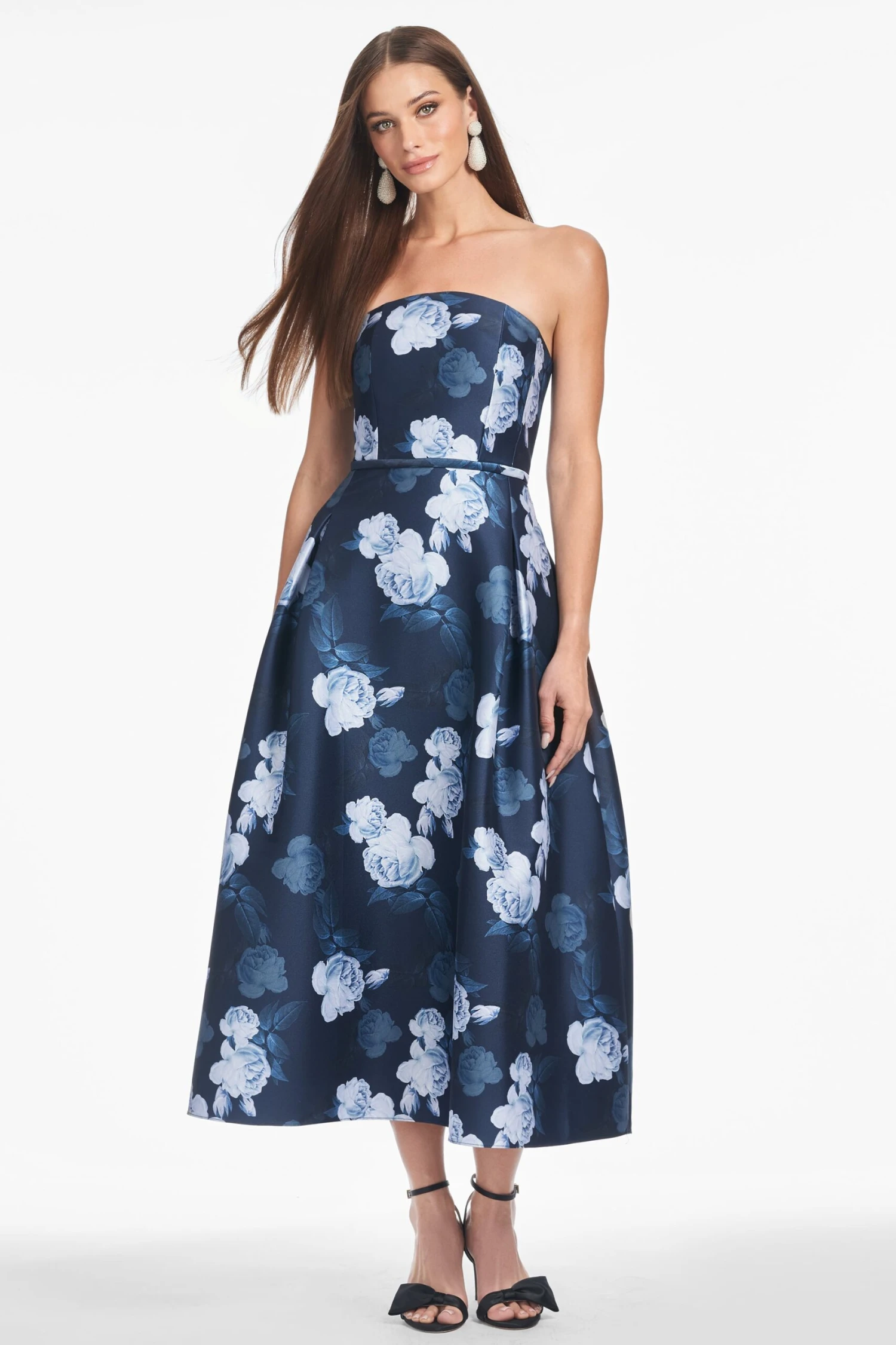 Simply put, Shay is something special. This strapless, tea-length stunner features a fitted bodice that perfectly cascades into an A-line skirt. There you’ll find our Midnight Glacial Rose print, amplifying the already elegant silhouette into a true work of art.