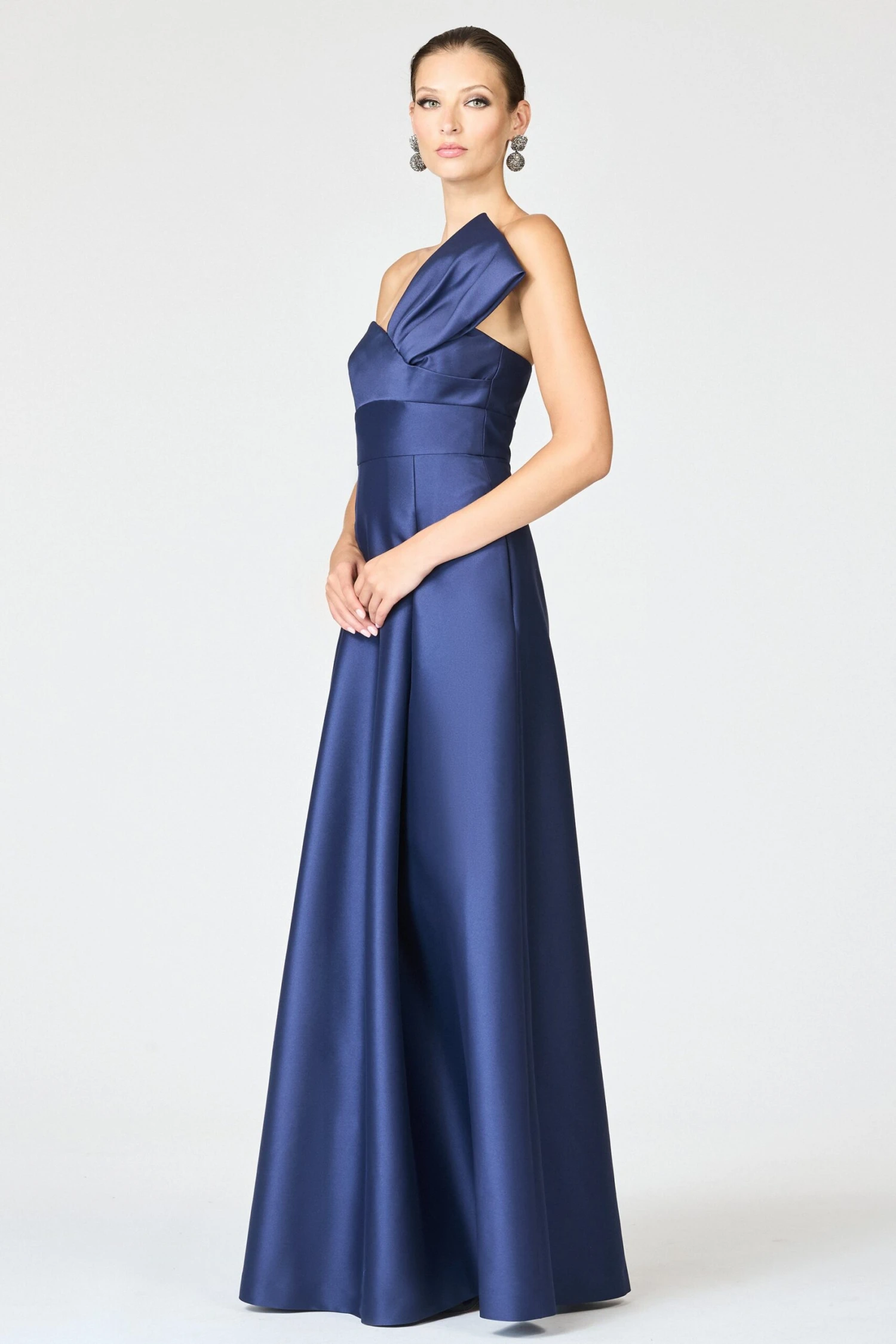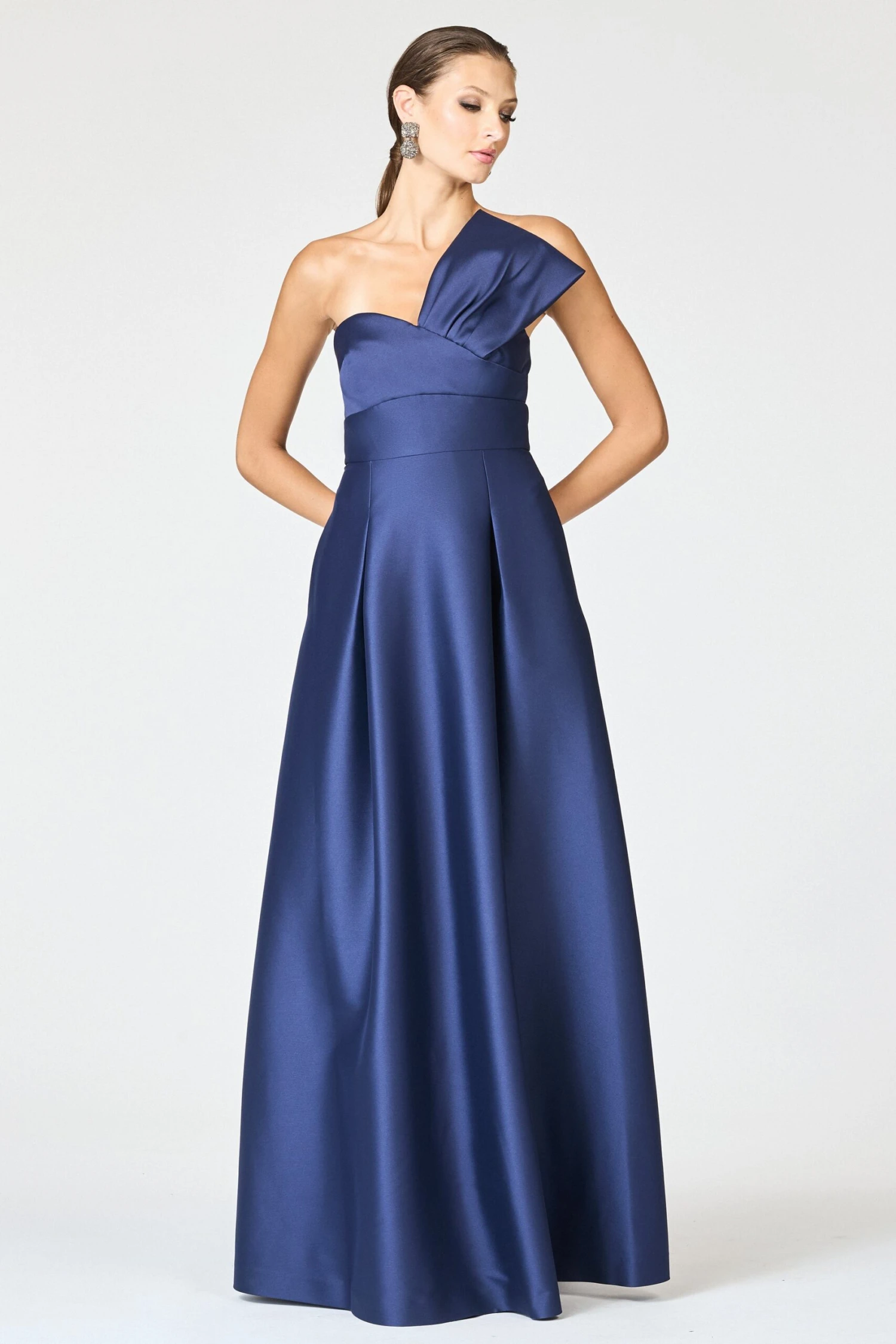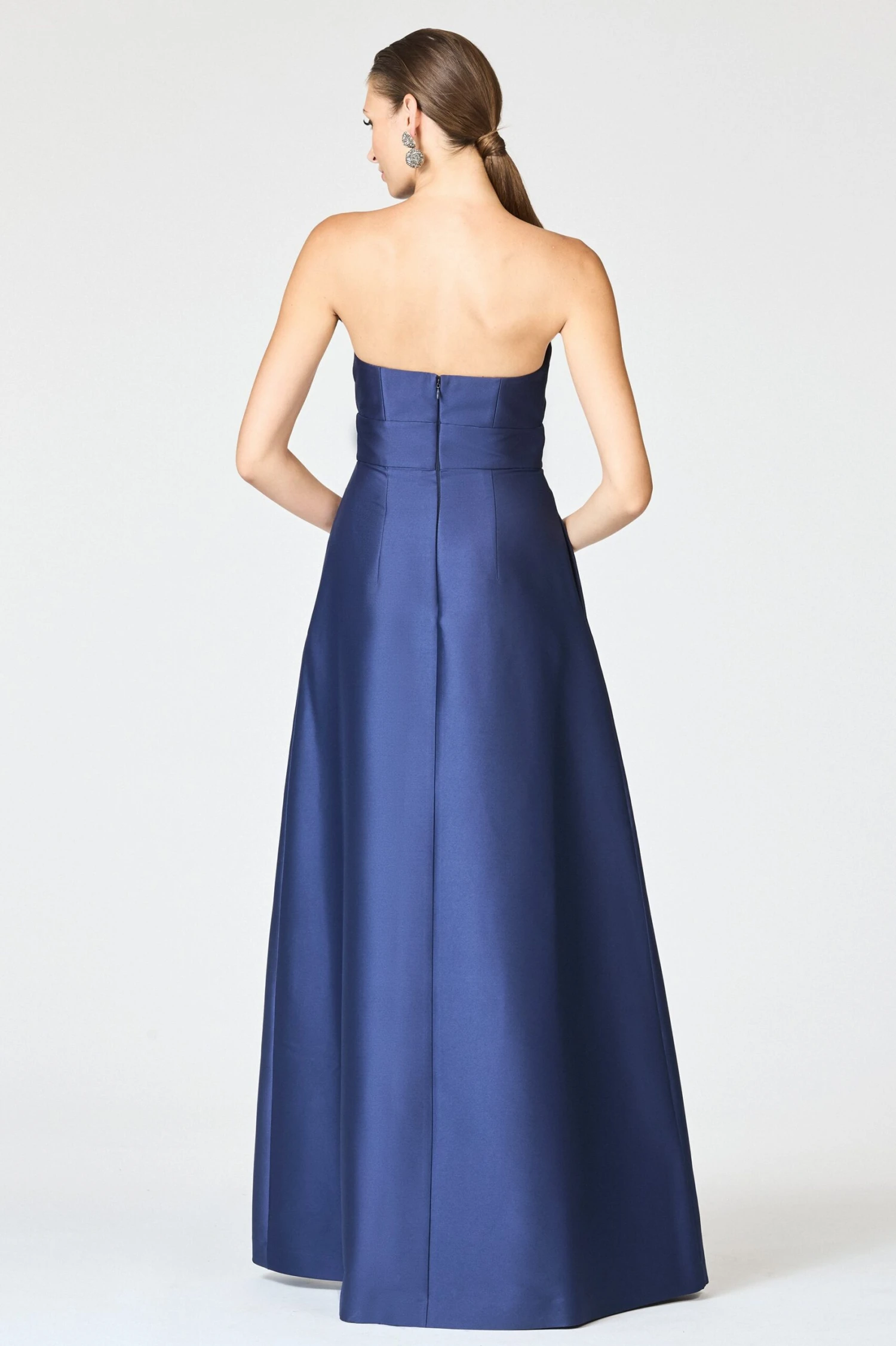 Sculptural and sophisticated, the Stephie Gown is a study in modern evening elegance. Cut from lustrous satin in a rich shade of Night Sky, this floor-length silhouette features a dramatic strapless neckline with a softly pleated accent that frames the décolletage. The bodice is precisely tailored with a wide waistband to define the waist, while deep pleats give the A-line skirt structure and movement. Striking in its simplicity, the Stephie Gown is an elevated choice for black-tie occasions and formal celebrations alike.