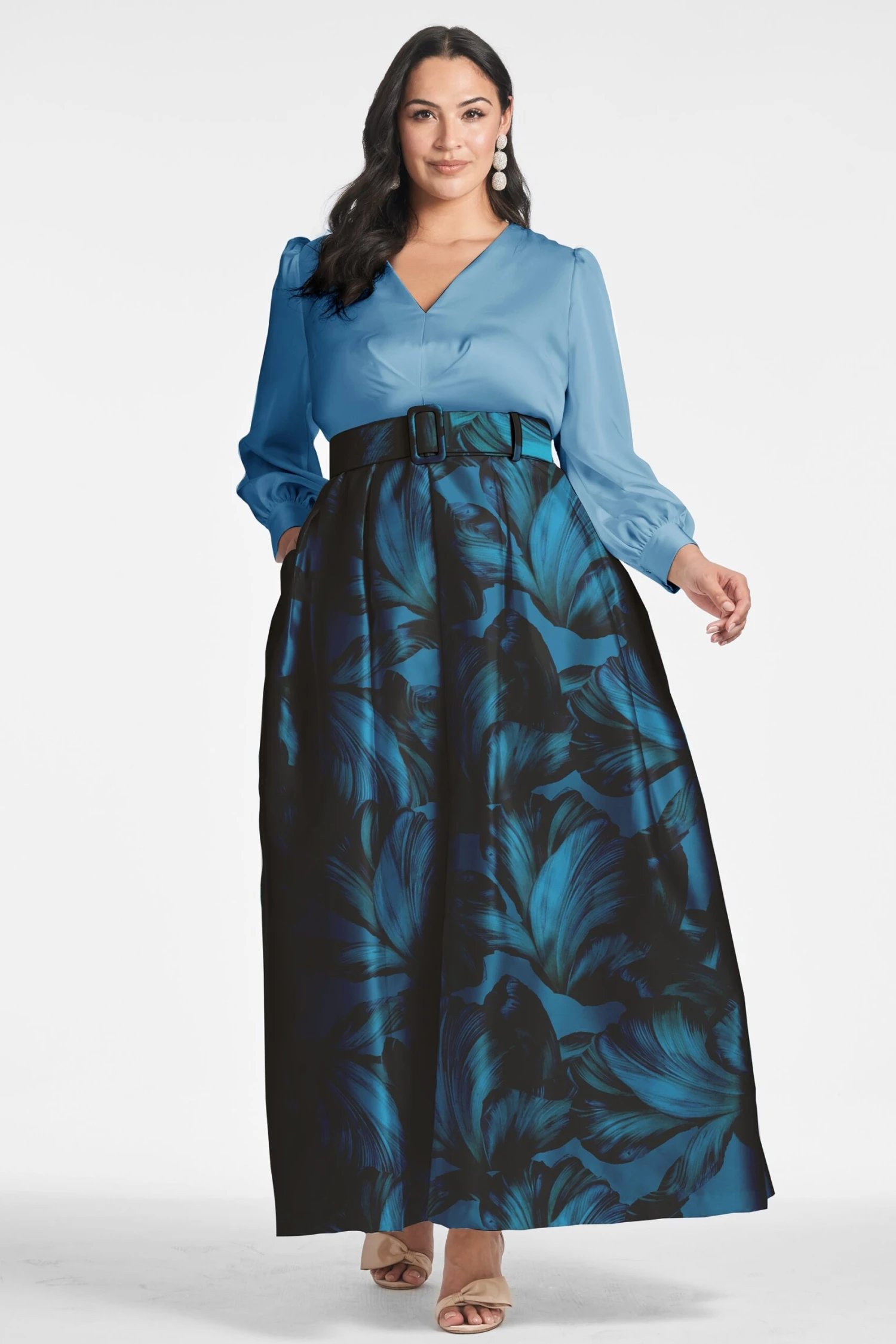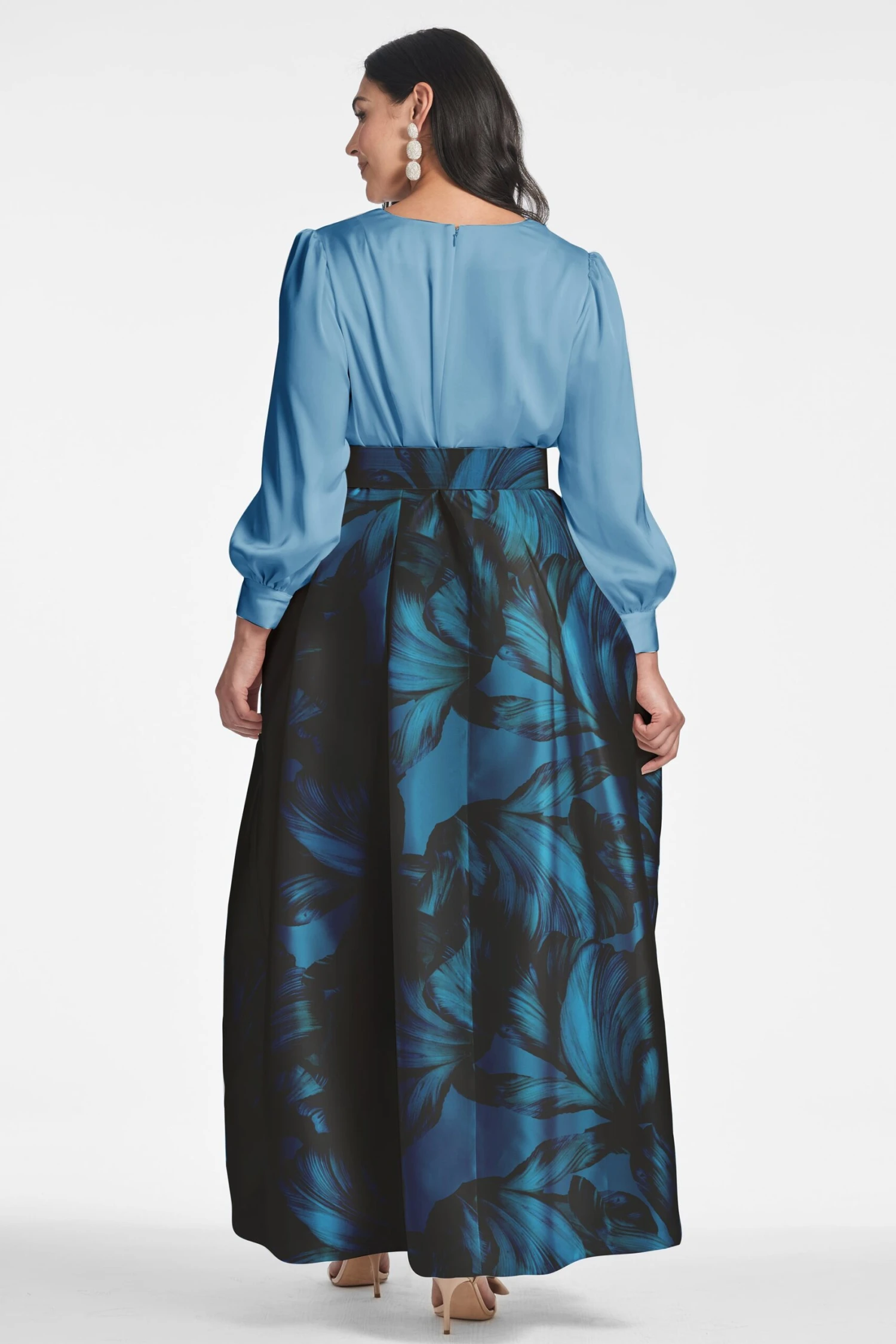 The Zoe Gown is the “Grande Dame” of the occasion. The deep V-neck smokey slate satin crepe bodice meets the printed Mikado self-belt to join the classic ball skirt with its soft, box pleating. At the front a discreet, but still dramatic, front slit and at each side a side slit pockets.
